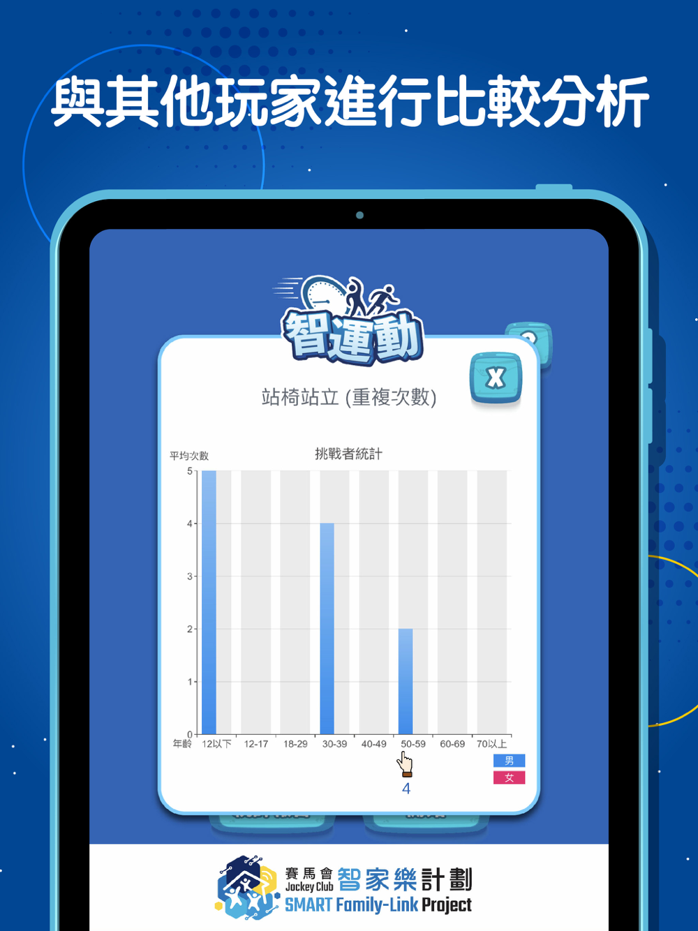 大家可以透過此應用程式測試一下自己的「智運動」指數!玩者可以在「站椅站立」及「單腳企」的兩項運動模式裡,測試一下自己的體能之餘也可以與朋輩的成績對比!做運動同時可以與友同樂、又可以隨時隨地做運動,鍛練身體無難度,就是「智運動」!