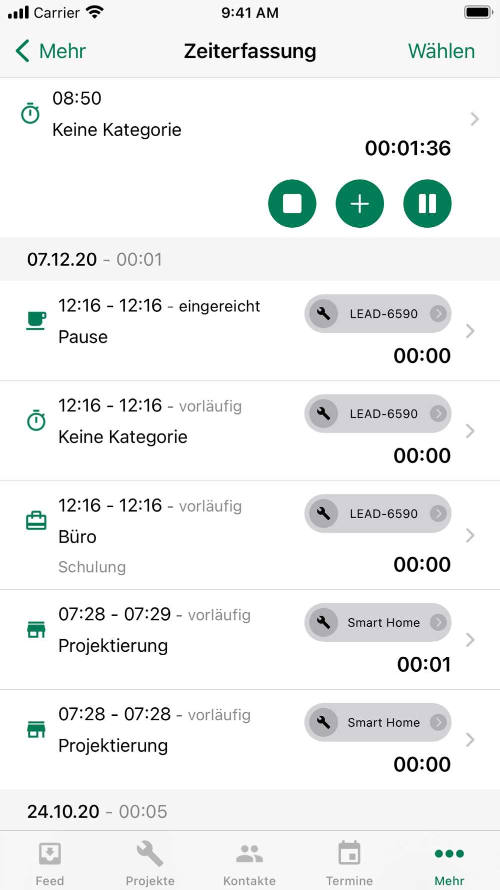 * Zeitabschnitte unterschiedlichen “Kategorien” wie Fahrzeit und Projekten zuordnen