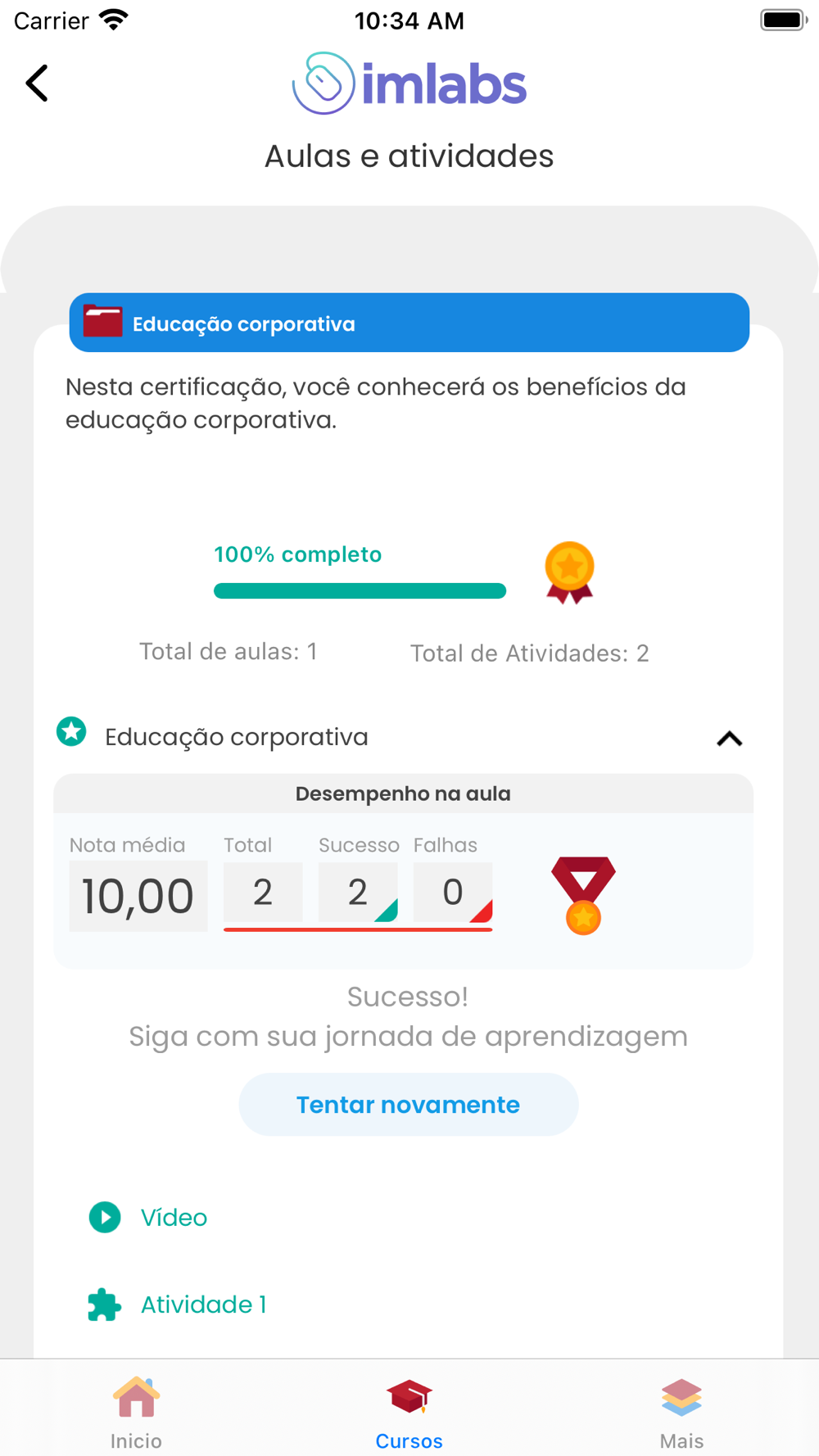 Listagem e acompanhamento de progresso dos cursos e possibilidade de emissão de certificados.