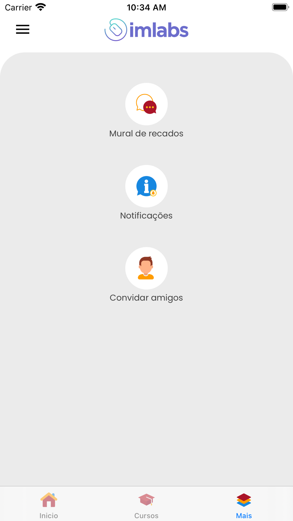 Área com mural de recados, notificações e compartilhamento do aplicativo com outros usuários.