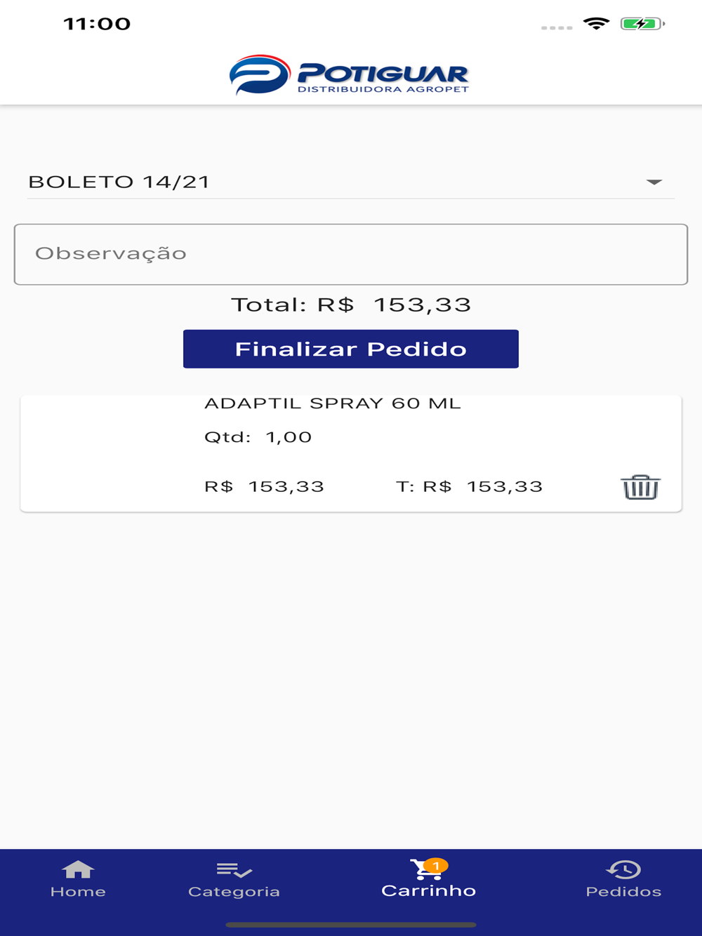 Esse pedido será enviado para o servidor da empresa Potiguar Distribuidora, para processamento e entrega dos produtos.