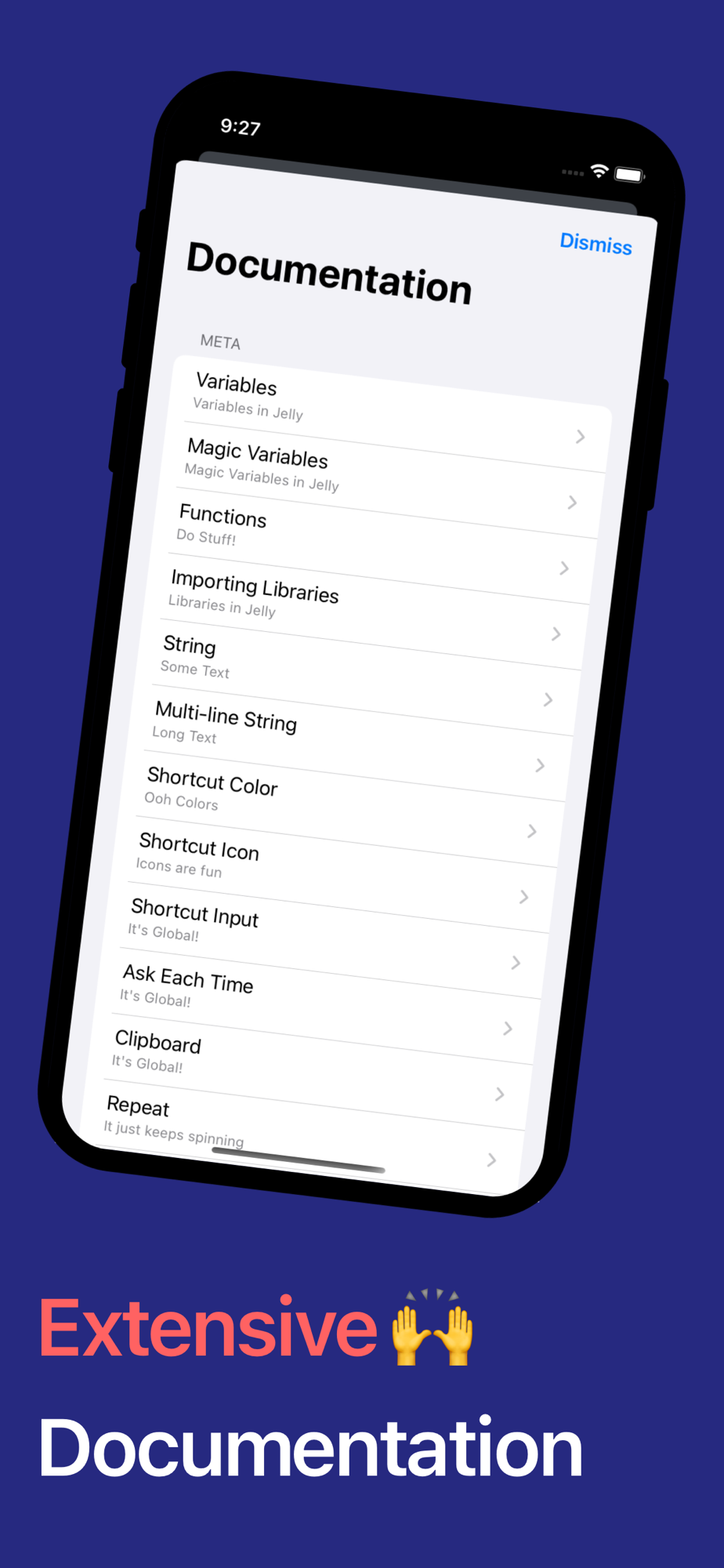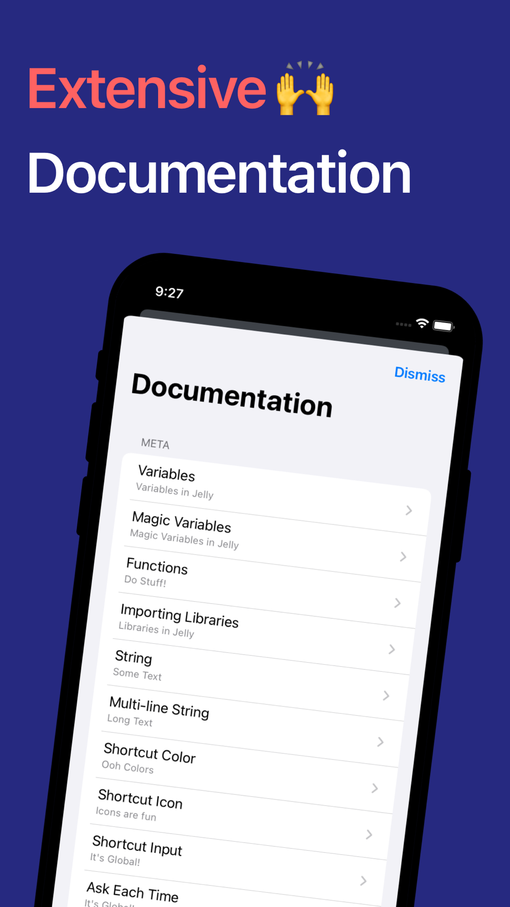 Switching from coding Shortcuts in the Shortcuts App to coding in Jellycuts is super easy. Features like the Icon Creator and JSON Dictionary Builder allow you to transfer your knowledge of Shortcuts into Jellycuts.