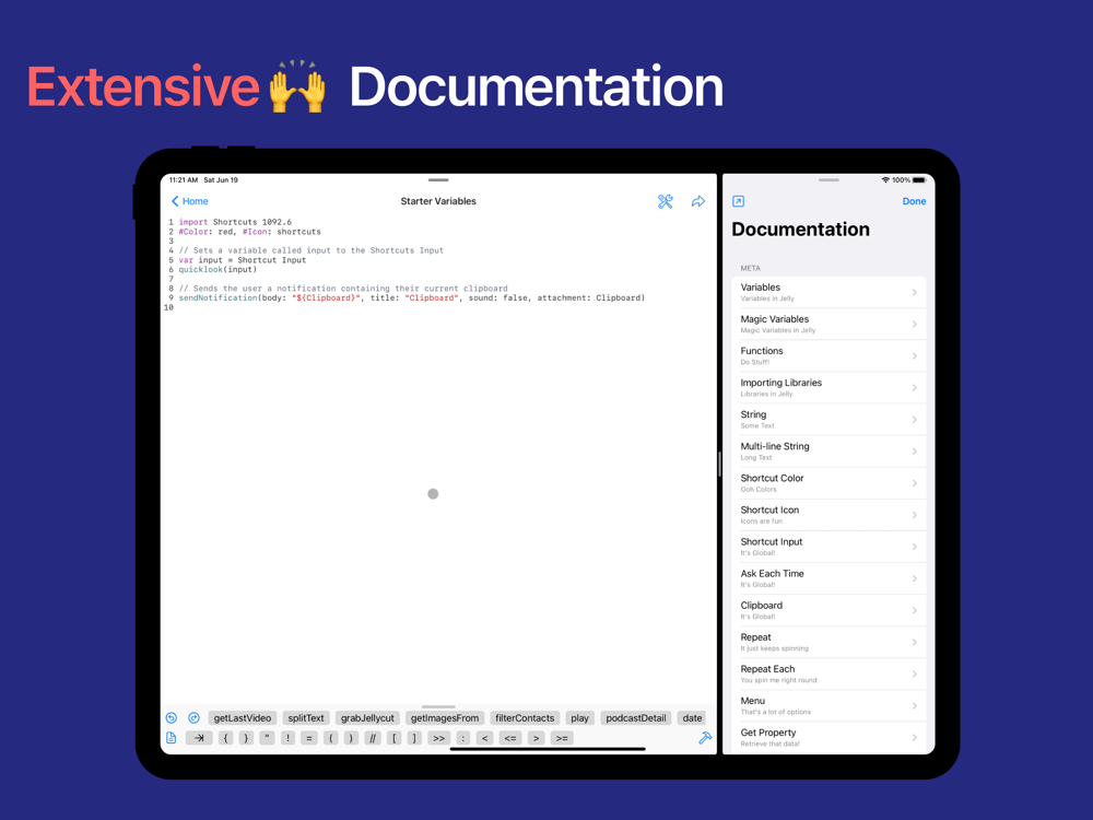 Jellycuts is a programming tool that allows you too quickly and efficiently write Powerful Shortcuts right on your iPad or iPhone.