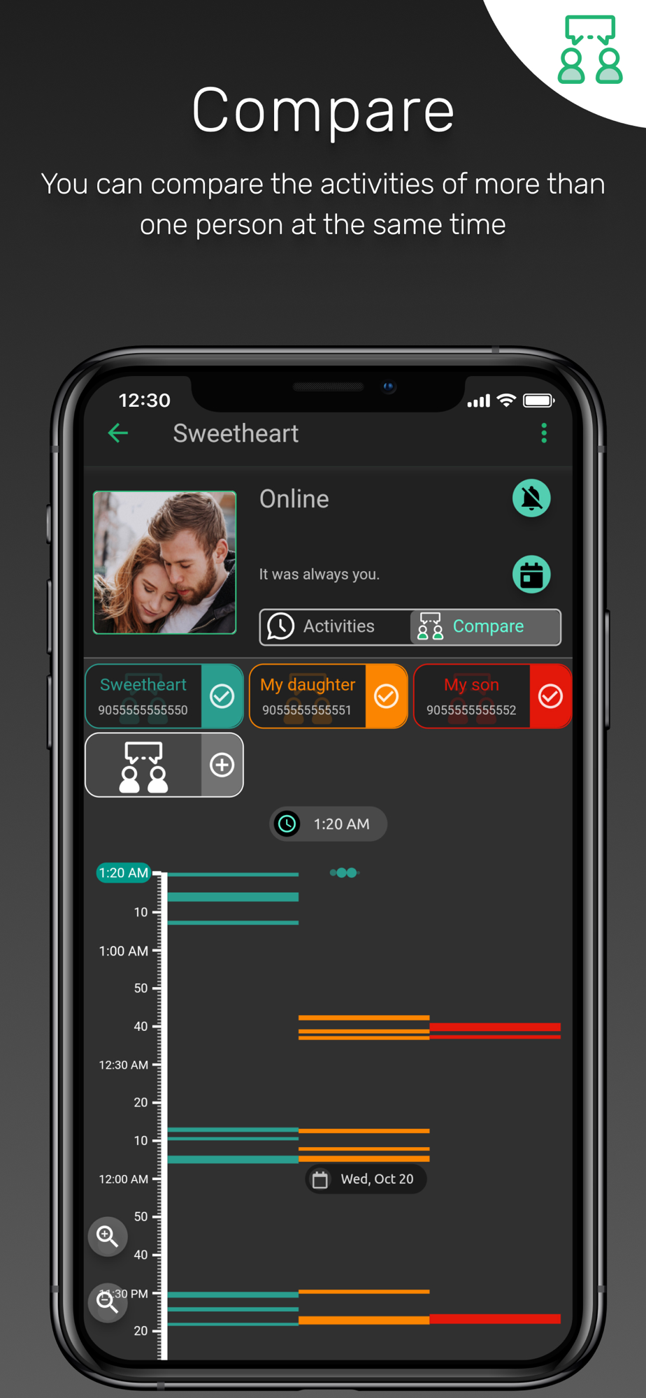 How much time do they spend on popular messaging apps? How long and when are they online? Who are they online with at the same time? Whenzup provides you a detailed online activity report about it. You can also compare all the reports one another and maybe these interactions are exactly what you need to know.