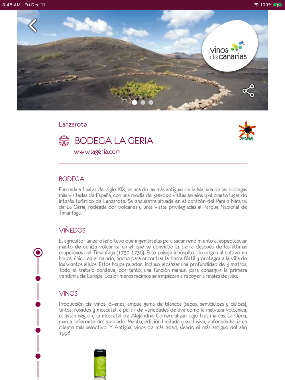 - Access complete information about the Canarian wineries, including contact, services, location, etc.