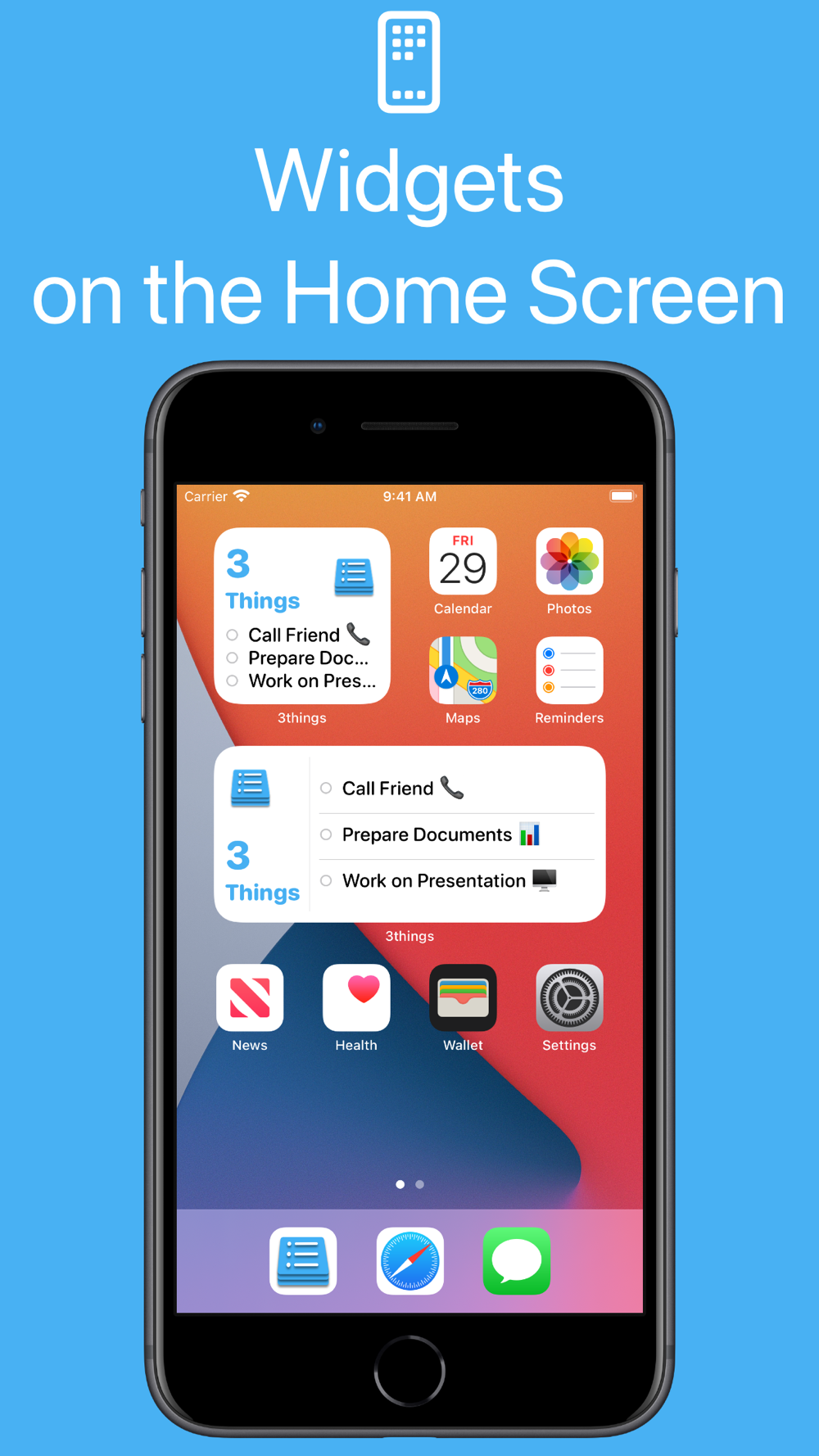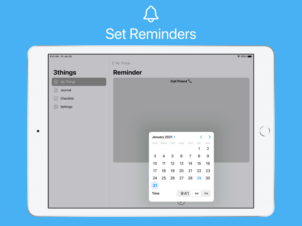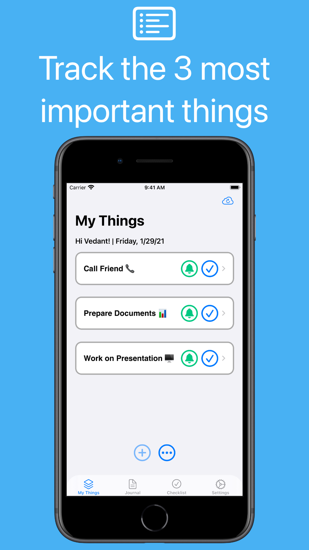 You can add up to three things to track. If you want to be reminded, you can schedule a reminder. Once you are done with your thing, simply press the done button! With only three important things, you stay focused and more organized!