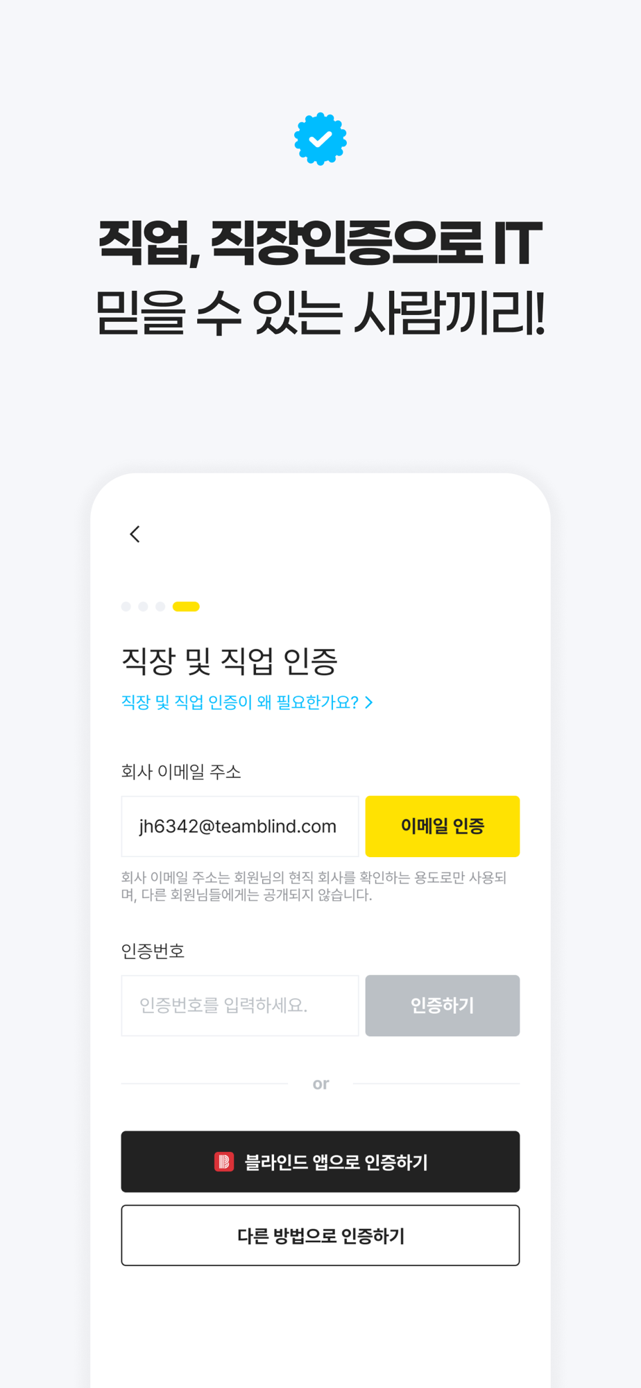 - 검증되지 않아 믿기 어려웠던 프로필 정보를 블라인드의 직장 인증 시스템으로 믿을 수 있는 프로필로 만들었어요