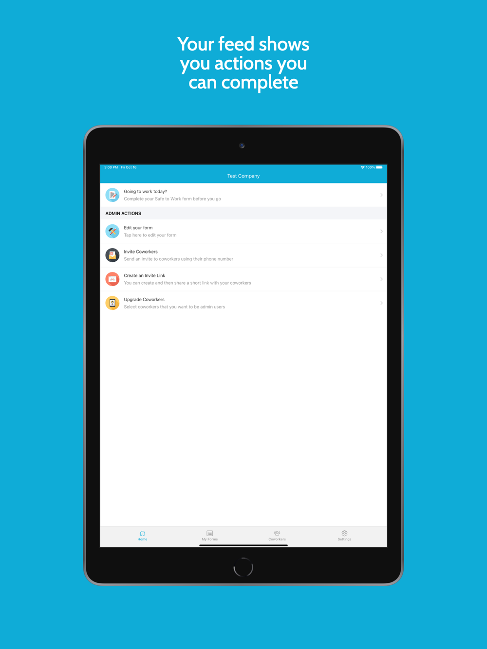 Designed with simplicity in mind, the Safe For Work app provides employees with the ability to report their current health status.