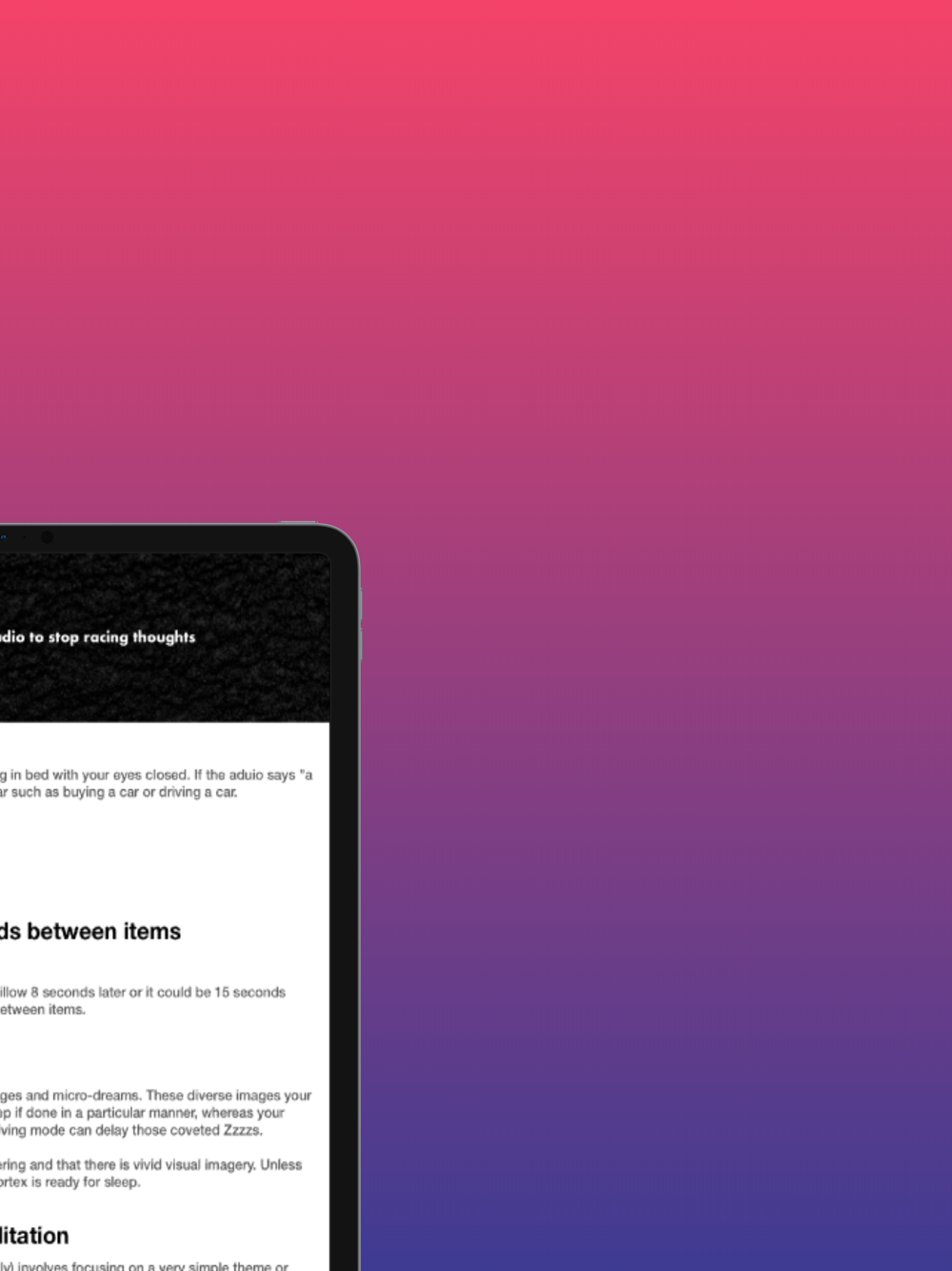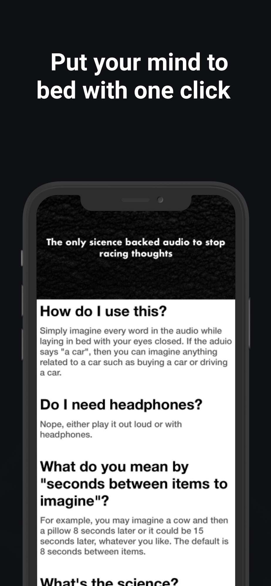 The only science-backed audio to stop racing thoughts. Simply tap a button and imagine the words being said to you while laying in bed with your eyes closed.