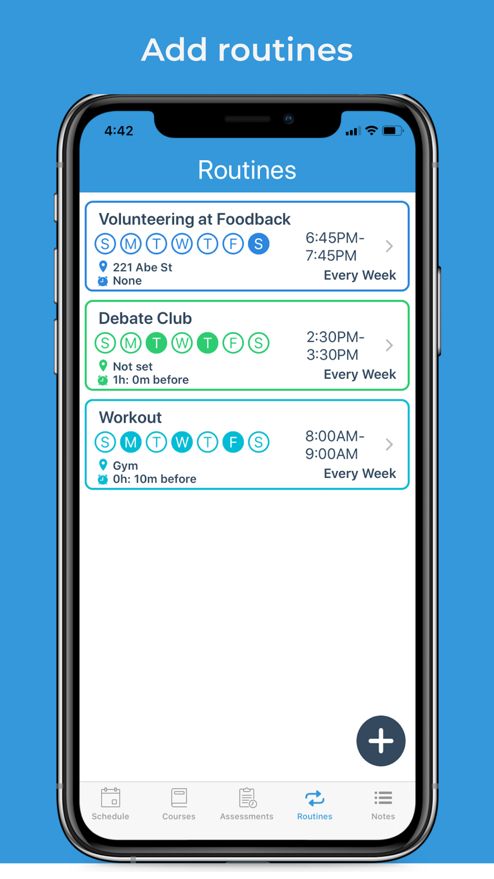 Since no student’s life ends in the classroom, UniPlan provides an additional section aimed at giving students a balanced extracurricular life. Once created, these routines will be displayed in your schedule, helping you balance any commitments you might have.