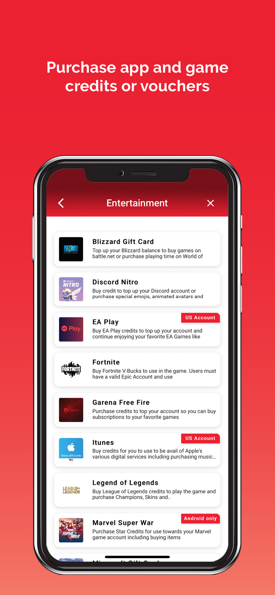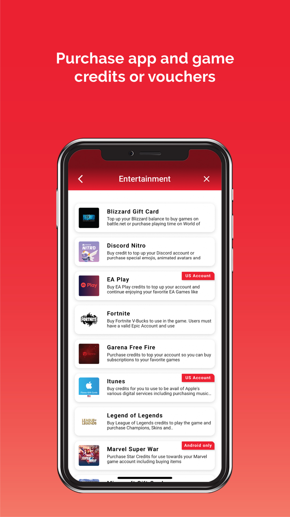 Entertainment: Purchase gift cards and credits for online subscriptions easily in a few clicks.