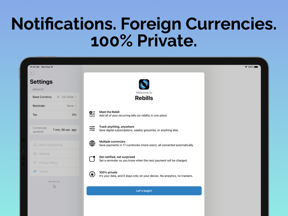 Keep track of all of your recurring bills, or rebills! All in One Place ----------------- Add digital subscriptions, monthly loan payments, credit card bills, lawn care services, childs allowance, or any other recurring expense you can imagine! Rebills helps you mange subscriptions and their payments with early notifications and a clean UI to make it easy to see your upcoming payments! Metrics and Calculations ------------- Add details to your rebills, such as start date, tax surcharge, description, and even amounts in foreign currencies! Notifications ----------- Set notifications on your rebills to get alerted in advance of getting billed. Never forget to cancel an expensive annual subscription, or cancel a free trial! Private. 100%. ------------ Your data is your data. The information you store in Rebills stays on your device, and there are no trackers or analytics services spying on your use of the app.