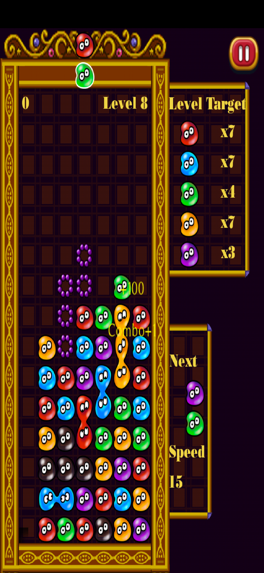 This is a classic drop and match puyo game. Colorful beans were drop down and meagered with ones with same color. When the number of merged beans reach 4, a magical explosion will appear. Super explosion will appear when the much number exceeds 4. You can even try chained combo which means one explosion caused by another.
