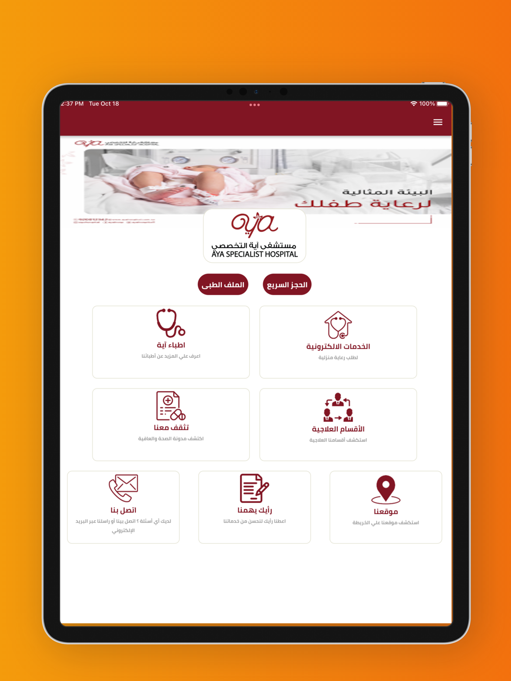 مستشفي آية تهدف توفير رعاية طبية إستثنائية و متكاملة على أسس و معايير طبية دولية. و نحن ملتزمون على الدوام بتقديم أحدث ما توصلت إليه التكنولوجيا في المجالات الطبية المختلفة وكذلك إلتزامنا بجلب أعلى الكفاءات المتميزة في المجالين الطبي و الإداري و ذلك للمحافظة علي جودة خدماتنا لمراجعينا الأعزاء و تقديم الخدمة لهم بكل أمانة و إحترام و ثقة..