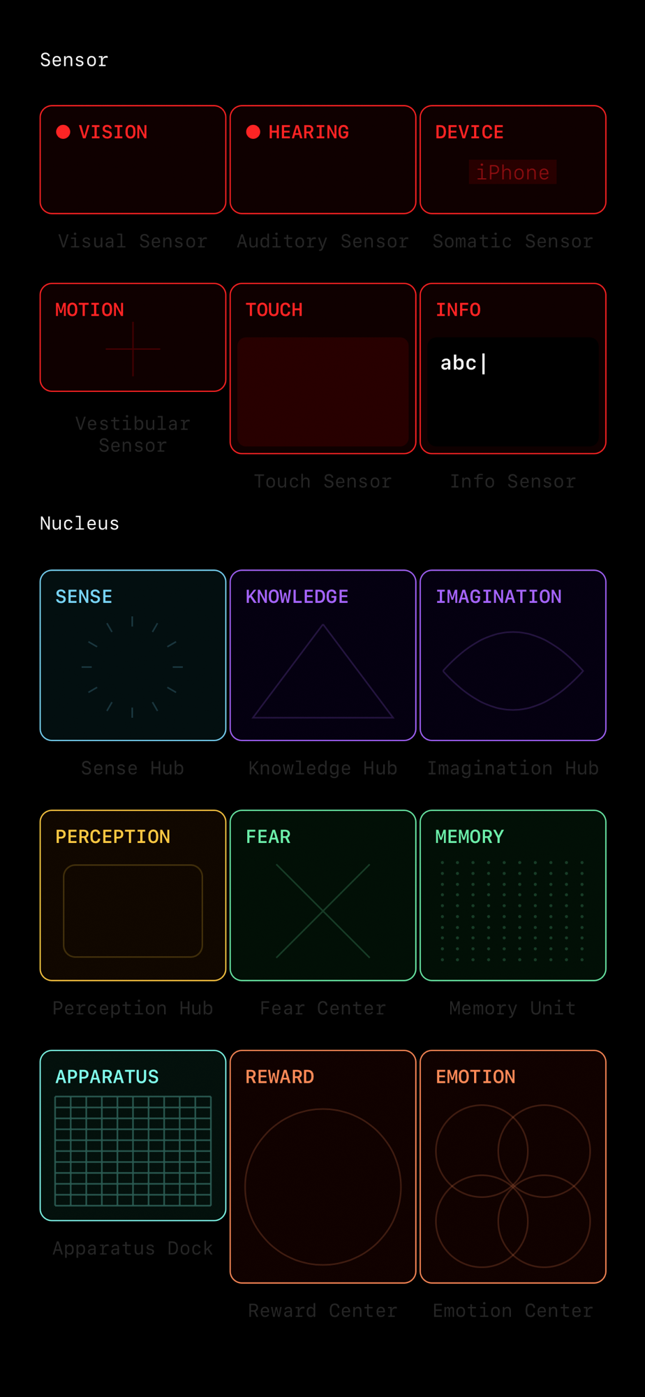 The six sensors resemble the human sensory system - sight, sound, touch, motion, body, and info. The behaviors include a wide way of output such as light, vibration, sound, images, and even smart home controls.