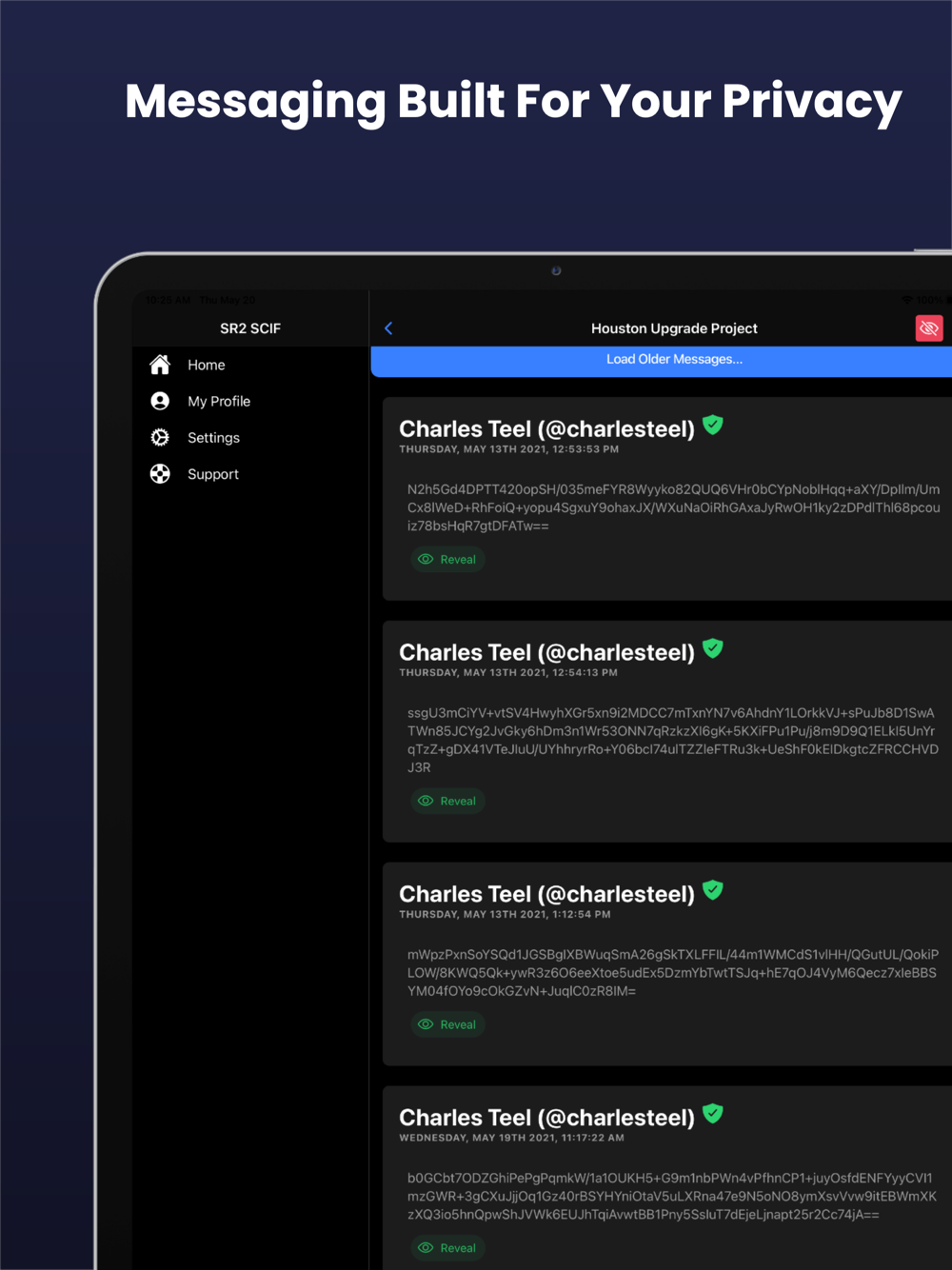 - Encrypted Messaging: every message that you send and receive is encrypted and decrypted on your device so that no one between you and the person you're talking to can ever read your conversation. We use a mix of Elliptic Curve Cryptography, and AES 256 Bit Cryptography. Simply the best most tested encryption available. Encryption that is implemented in such a way that not even the team at SR2 Solutions can read your messages.