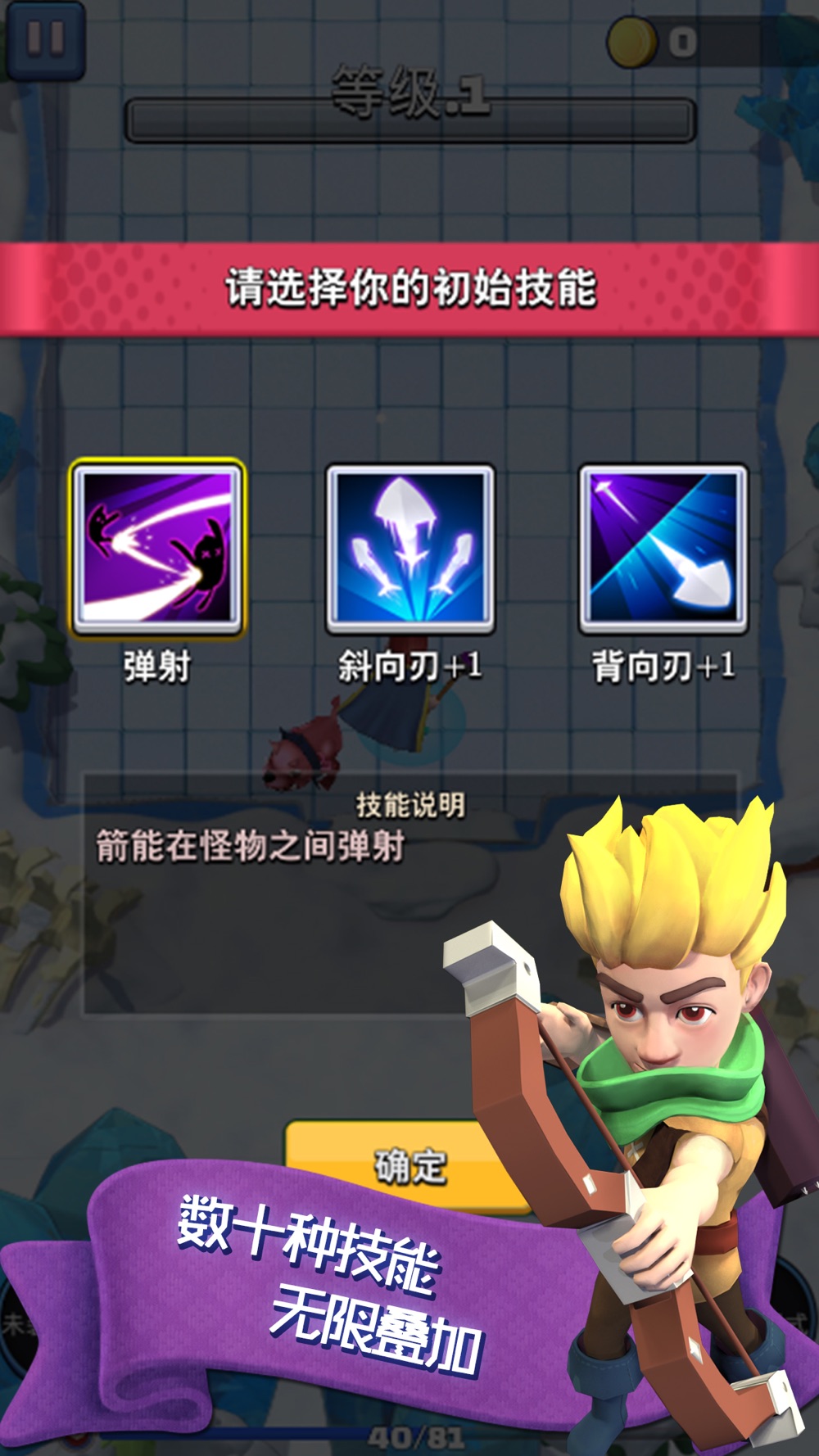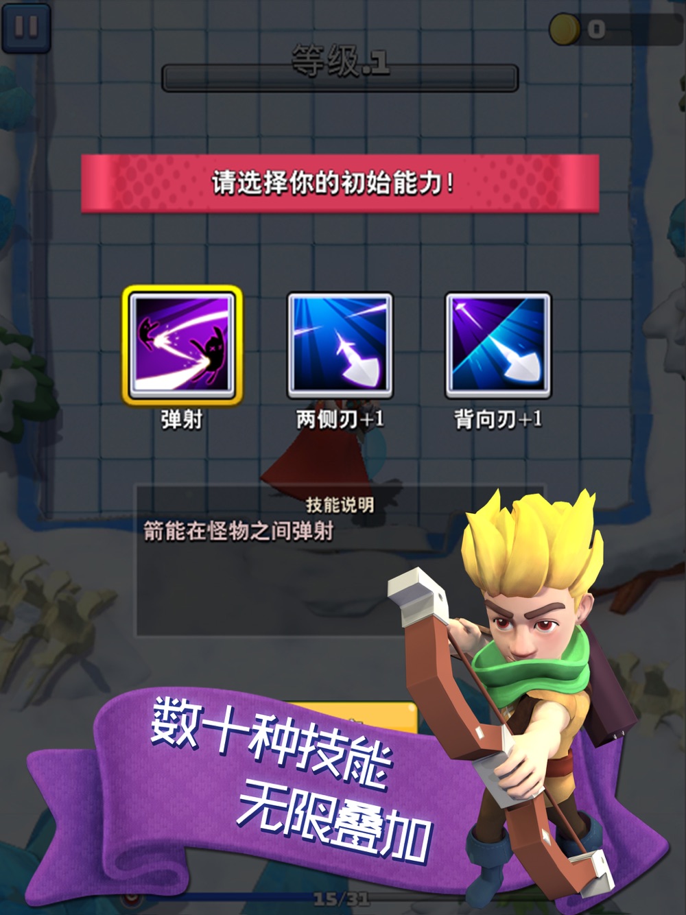 关卡中,每一次升级都可以获得一种技能,慎重选择,好的技能组合能更好的帮助您通关。