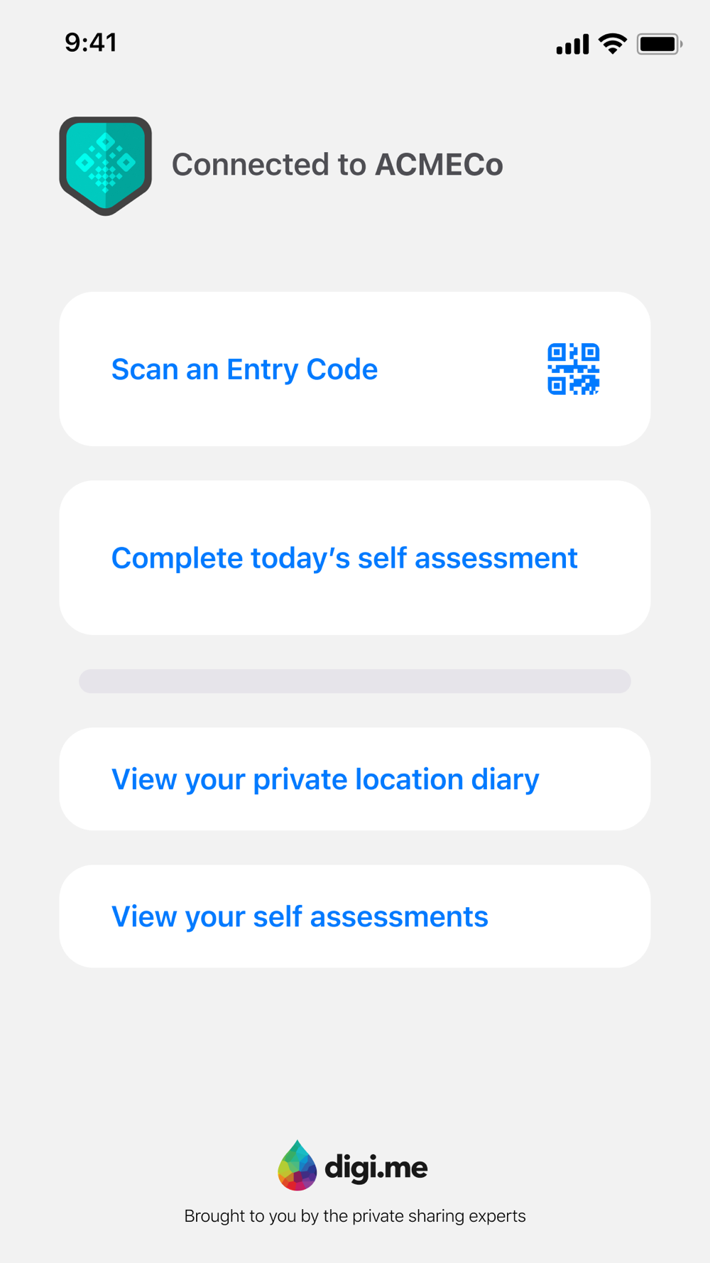 The Consentry app will also prompt you to complete a quick self-assessment every day. You will be asked if you would like to share your responses, anonymously, so your organisation can monitor general health trends and react accordingly.