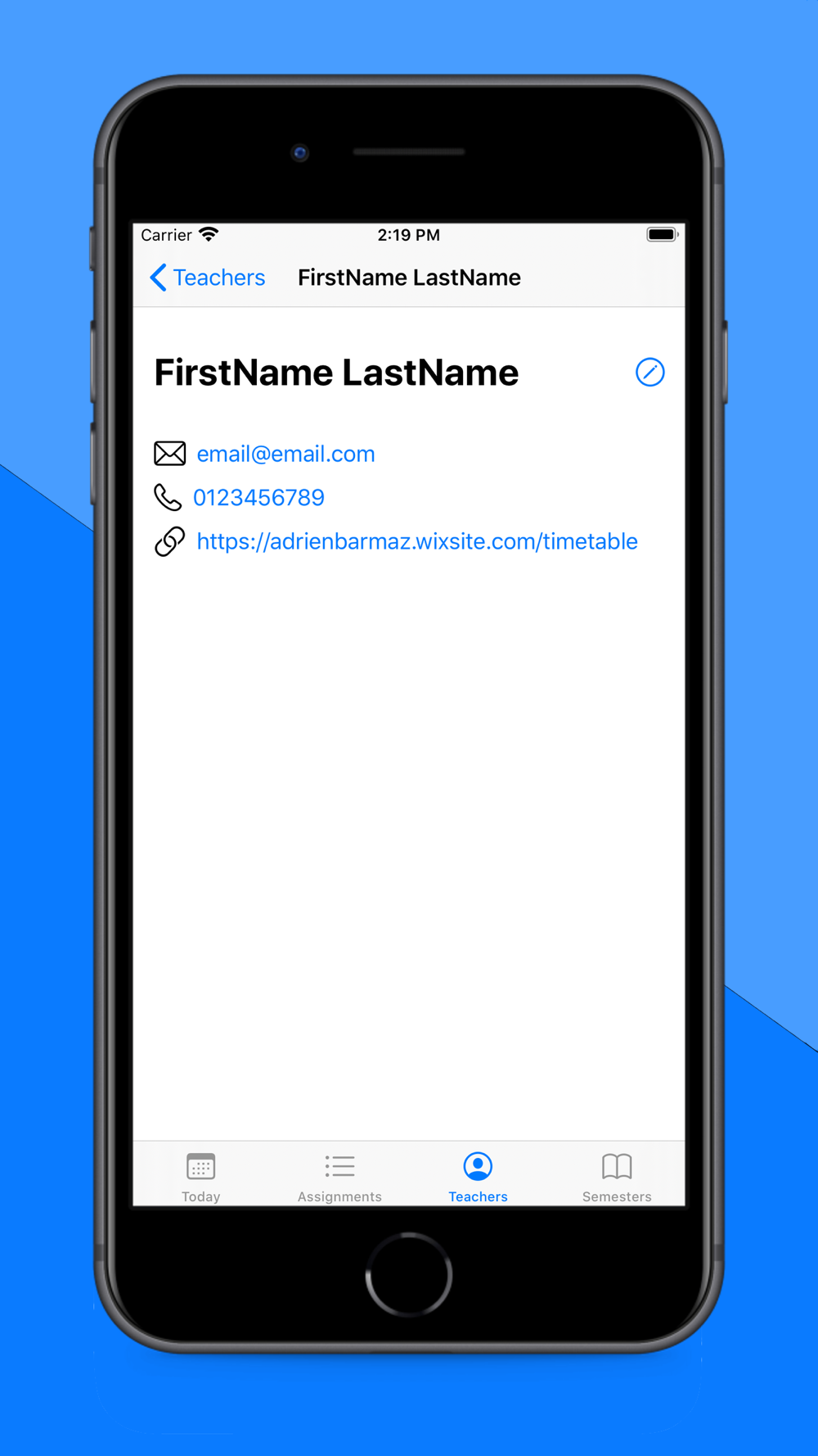 Sometimes it's hard to find the teacher's email address, phone number or link to their website. That's why it is possible to save all this information in the application so that you can find it quickly and easily.