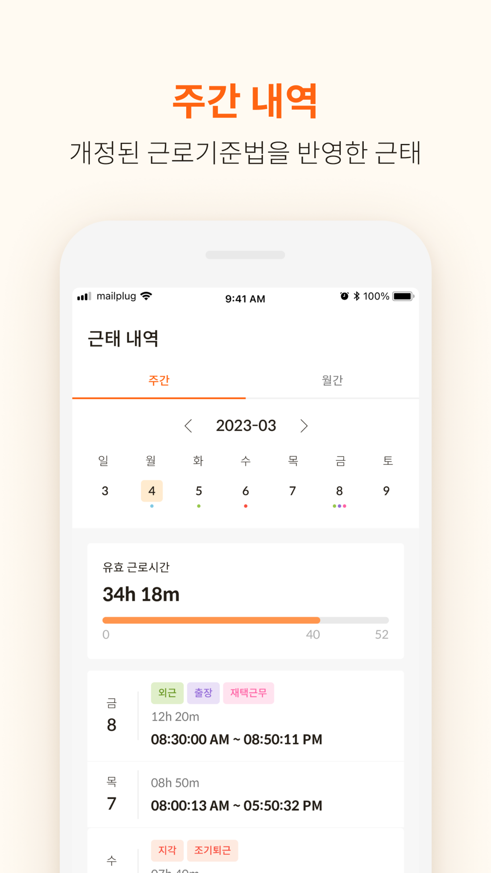 - 주간/월간 누적 근태 내역을 볼 수 있습니다.