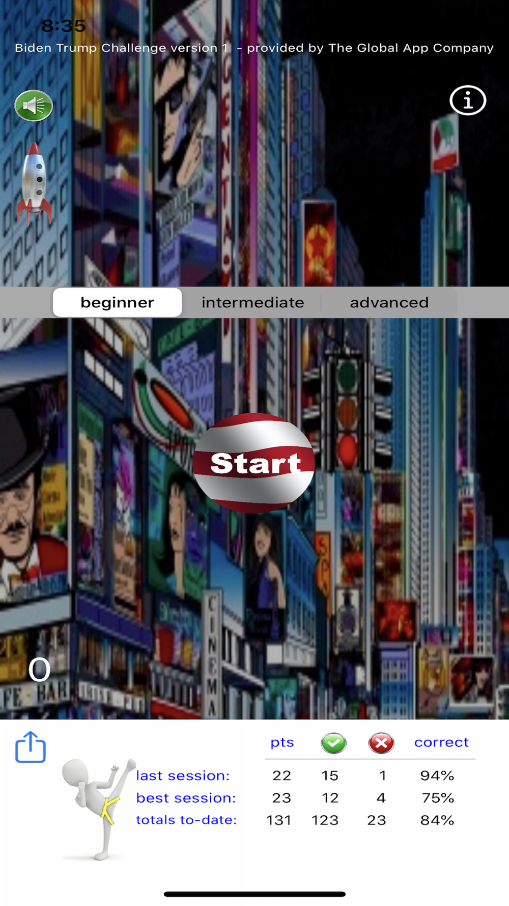 The app will test your quickness and challenge your ability to focus. Select the beginner level to become accustom to the interface and the challenge presented in the app. Then move up to the intermediate level and eventually try to master the advanced level. Each iteration runs for 59 seconds and if you score enough points you will be awarded with bonus time to allow you to earn additional points. As you accumulate points you will be awarded colored-belts to reflect your achievement levels. During play, keep an eye out for many distractions, including trains, airplanes, missiles and even Santa Clause. The app is connected to the apple game center which allows you to see how your score compares to others playing the game. We invite Joe Biden and Donald Trump or any politician to play the app to validate their mental alertness.