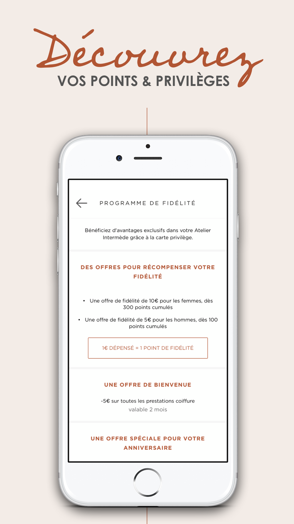 Grâce à l’application Mon Atelier Intermède, vous pouvez dans un seul espace consulter vos rendez-vous et votre compte fidélité. Vous n’êtes pas encore inscrit ? Pas de panique, vous pouvez créer votre compte privilège directement via l’application et ainsi bénéficier d’avantages et d’offres exclusives tout au long de l’année !