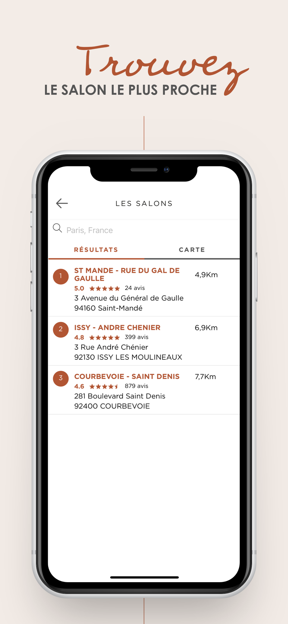 - Trouver le salon le plus proche de chez vous, consulter ses disponibilités et réserver instantanément votre prochain rendez-vous