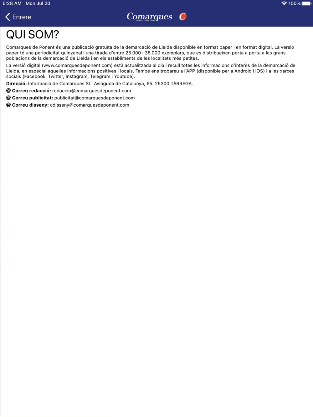 Aquesta aplicació permet visualitzar de manera virtual el diari de Comarques de Ponent, rebràs notificacions de les últimes notícies. A més podràs fer alguna gestio de contacte desde la mateixa aplicació.