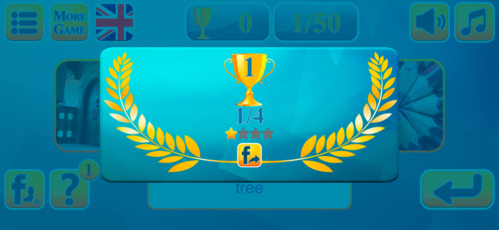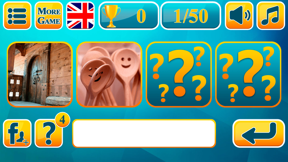 Rules are very simple: according to represemted 4 pictures it is necessary to guess a keyword. You can try to make it of two open images and to receive the maximum number of points. If it is impossible, then it is possible to open the remained 2 pictures, having pressed the hint that will allow to get more chances to guess the word. But by each pressing the hint you lose 1 point. Game consists of 50 interesting levels. The maximum number of points which can be earned for all game is 200 points!