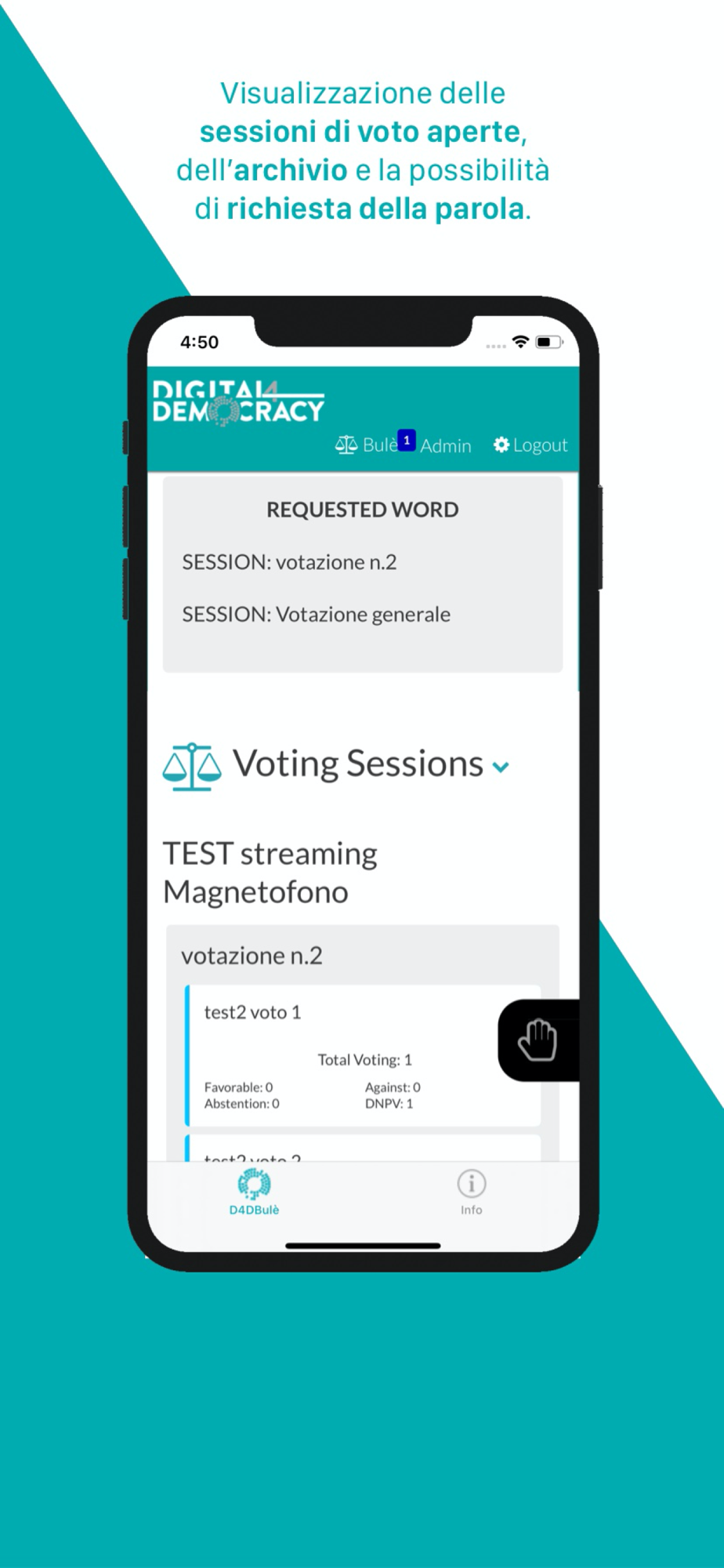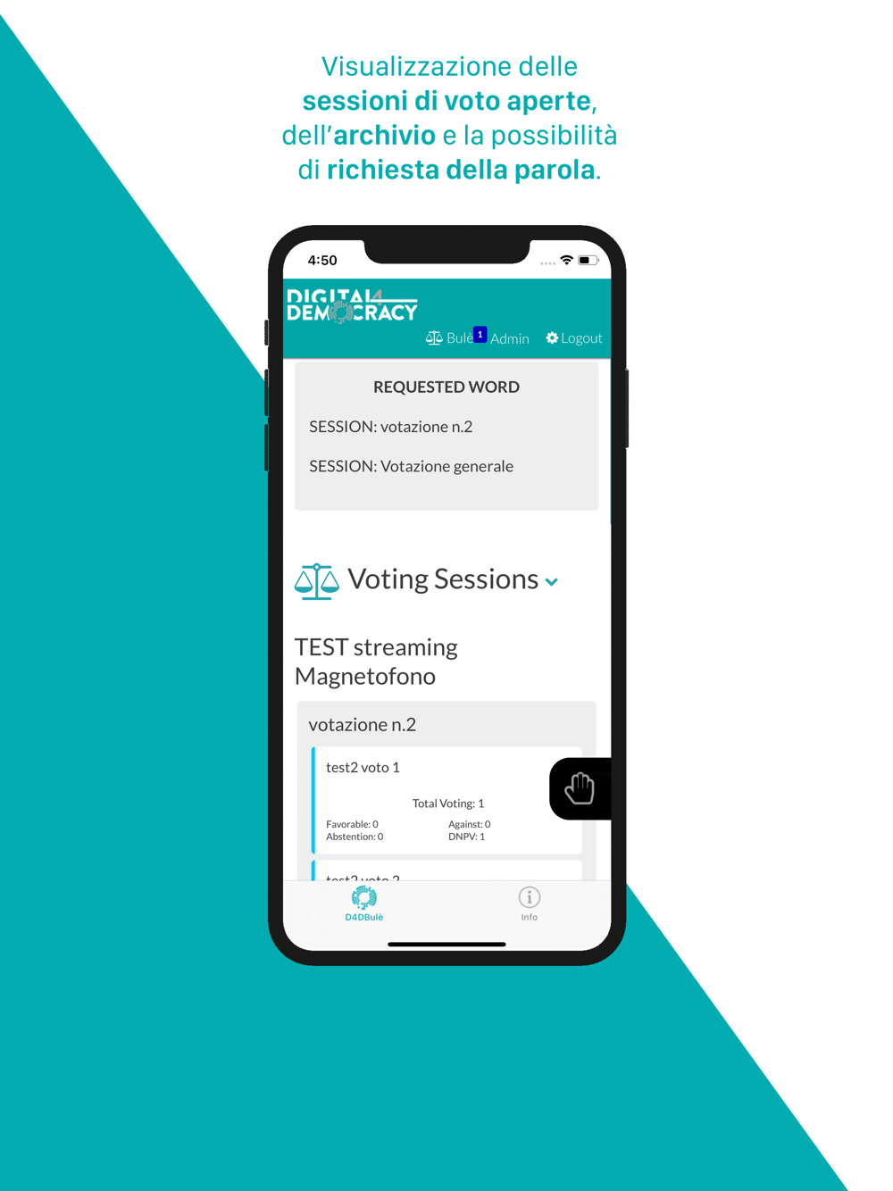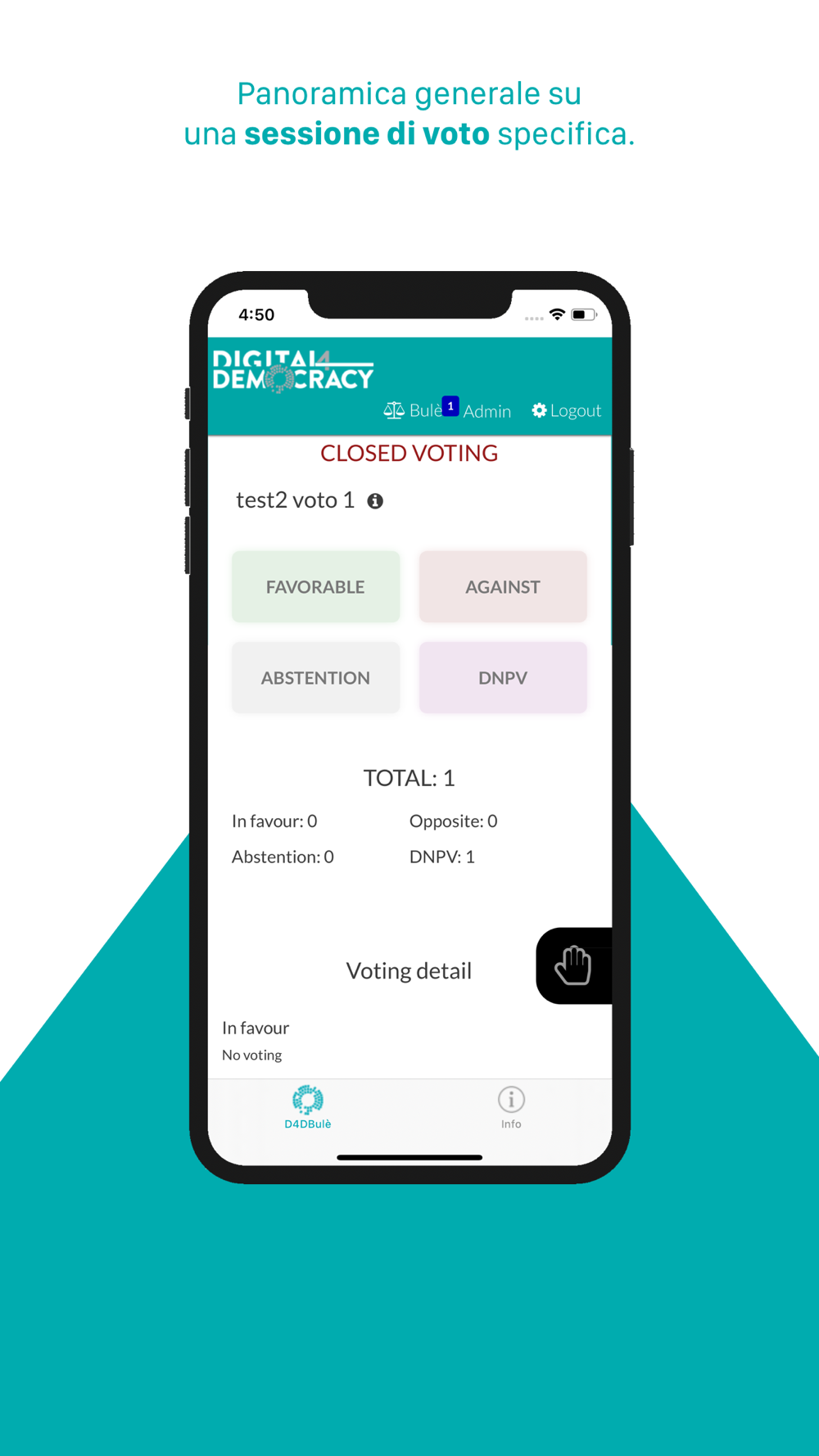 Inside the app there is an administrative panel accessible via web that allows you to create a voting session, check the number of participants who declare their presence, manage the voting session, collect, share and print the results.