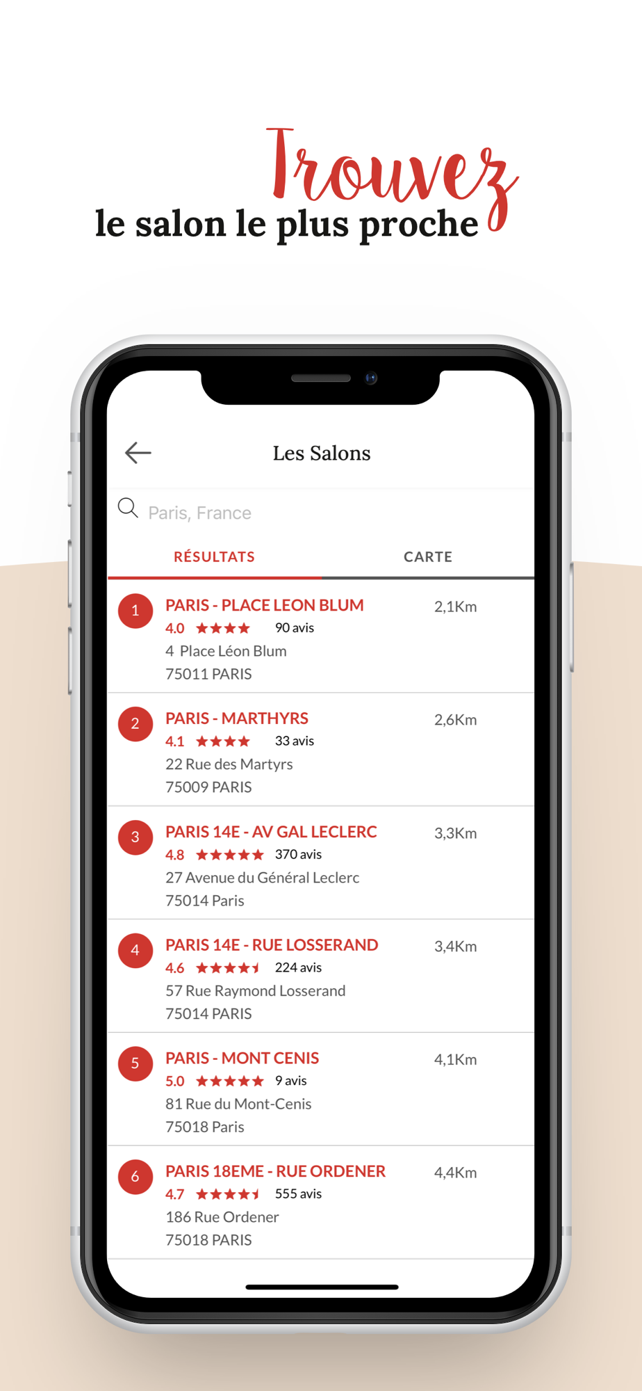 - Trouver le salon le plus proche de chez vous, consulter ses disponibilités et réserver instantanément votre prochain rendez-vous