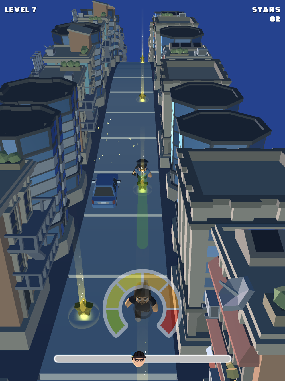 Touch and hold to turn into a police car and chase down the fleeing thieves. Tap fast to catch up and arrest them.