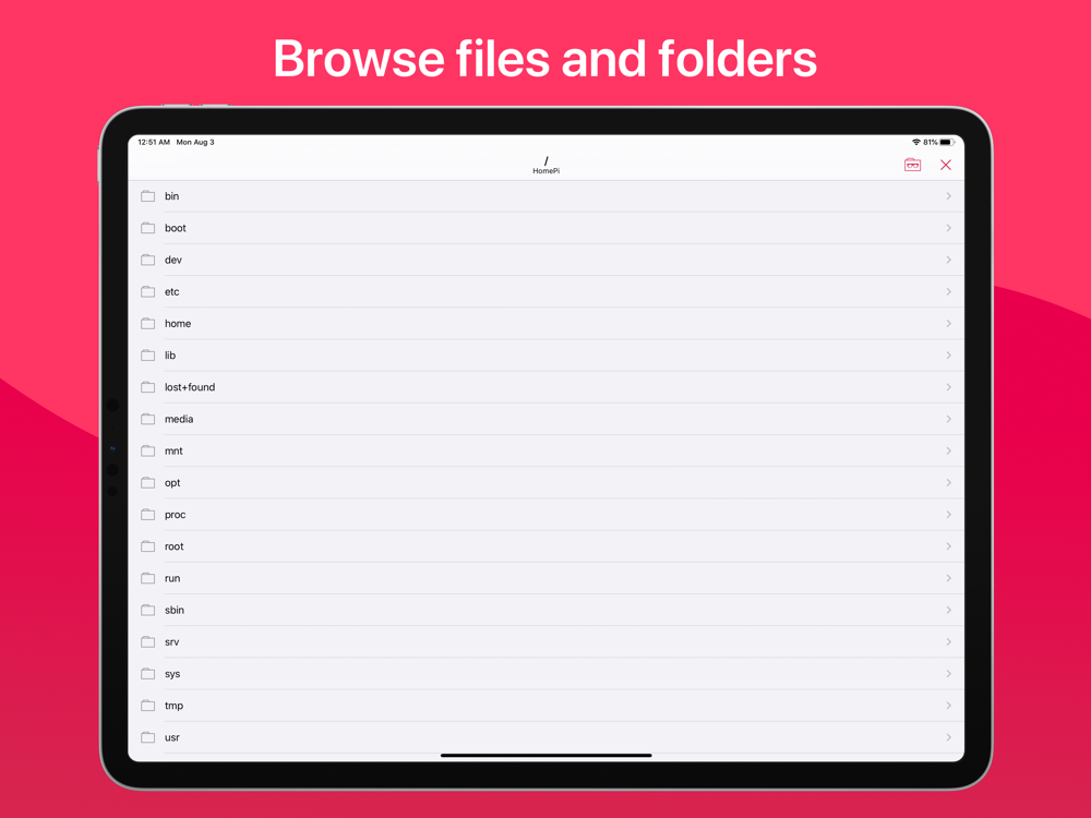 Access your Pi from a shell terminal with colored output and hardware keyboard support. The on-screen keyboard comes with fast access to commonly used special keys like ctrl and arrow keys.