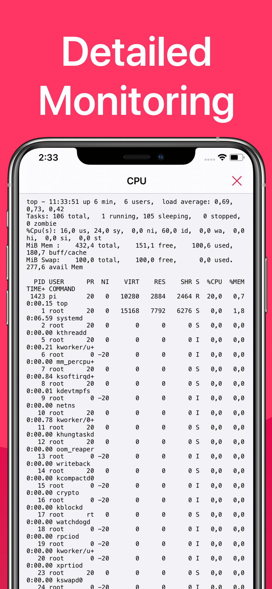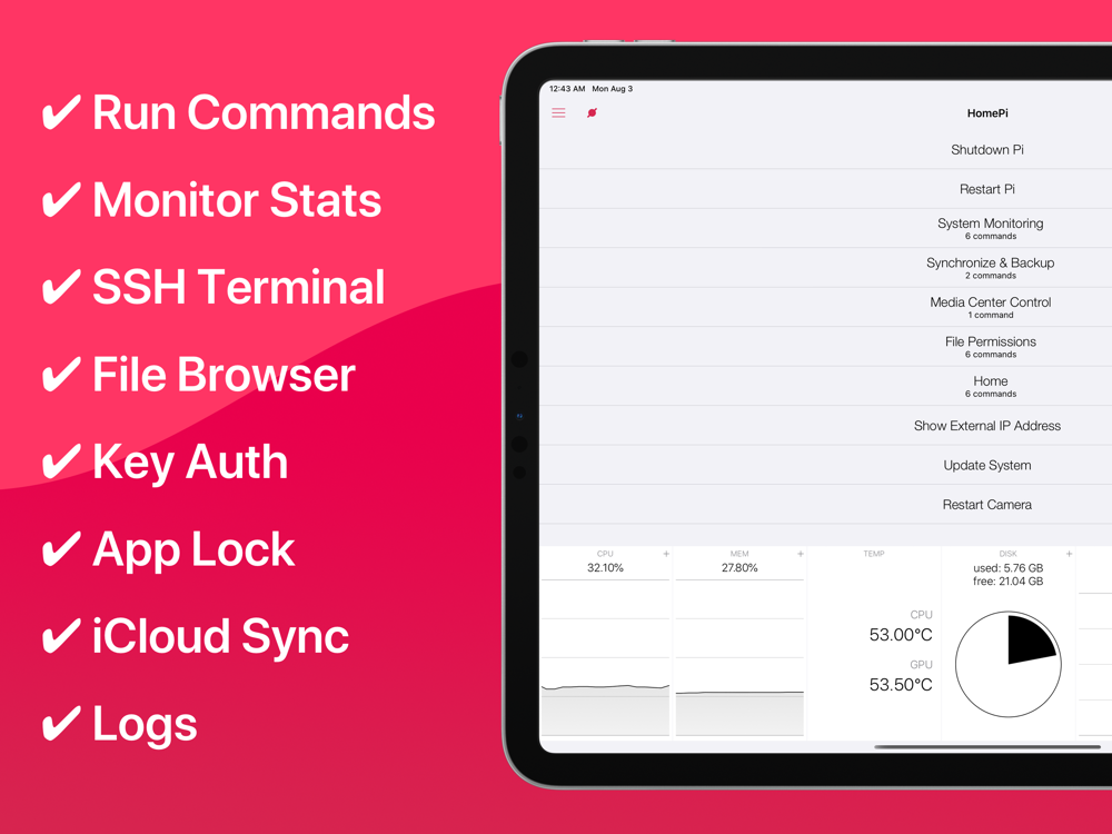 SimplePi is the Swiss army knife utility app for monitoring, controlling, and managing your Raspberry Pi using your iPhone and iPad.