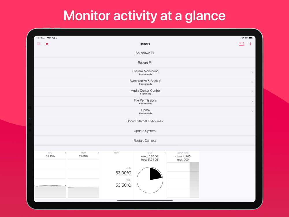 See what is going on with your Raspberry Pi. CPU, Memory, Temperature, Disk Usage, and Clock activity are shown in beautiful and easily understandable graphs.