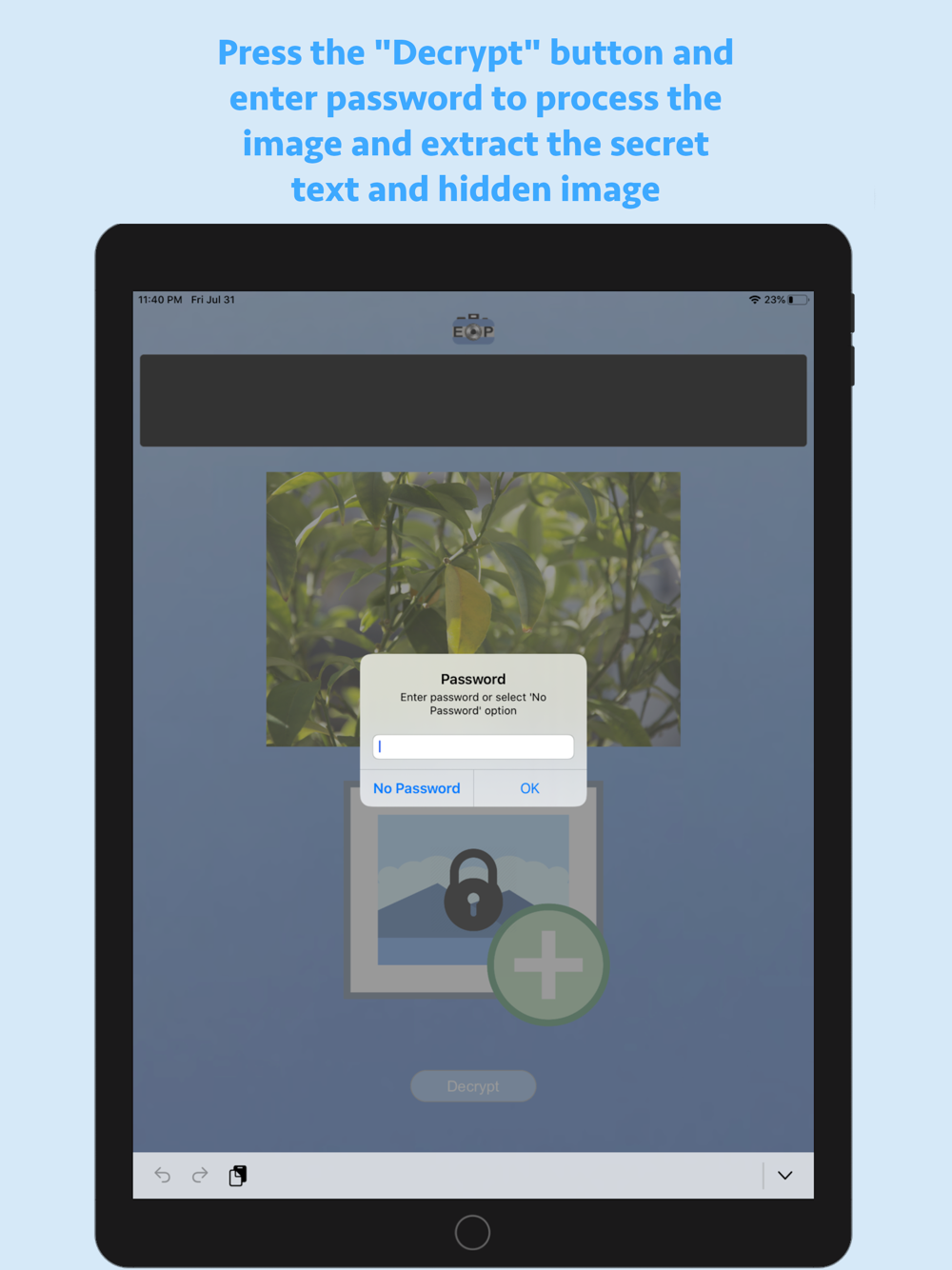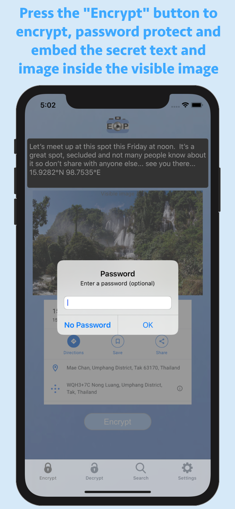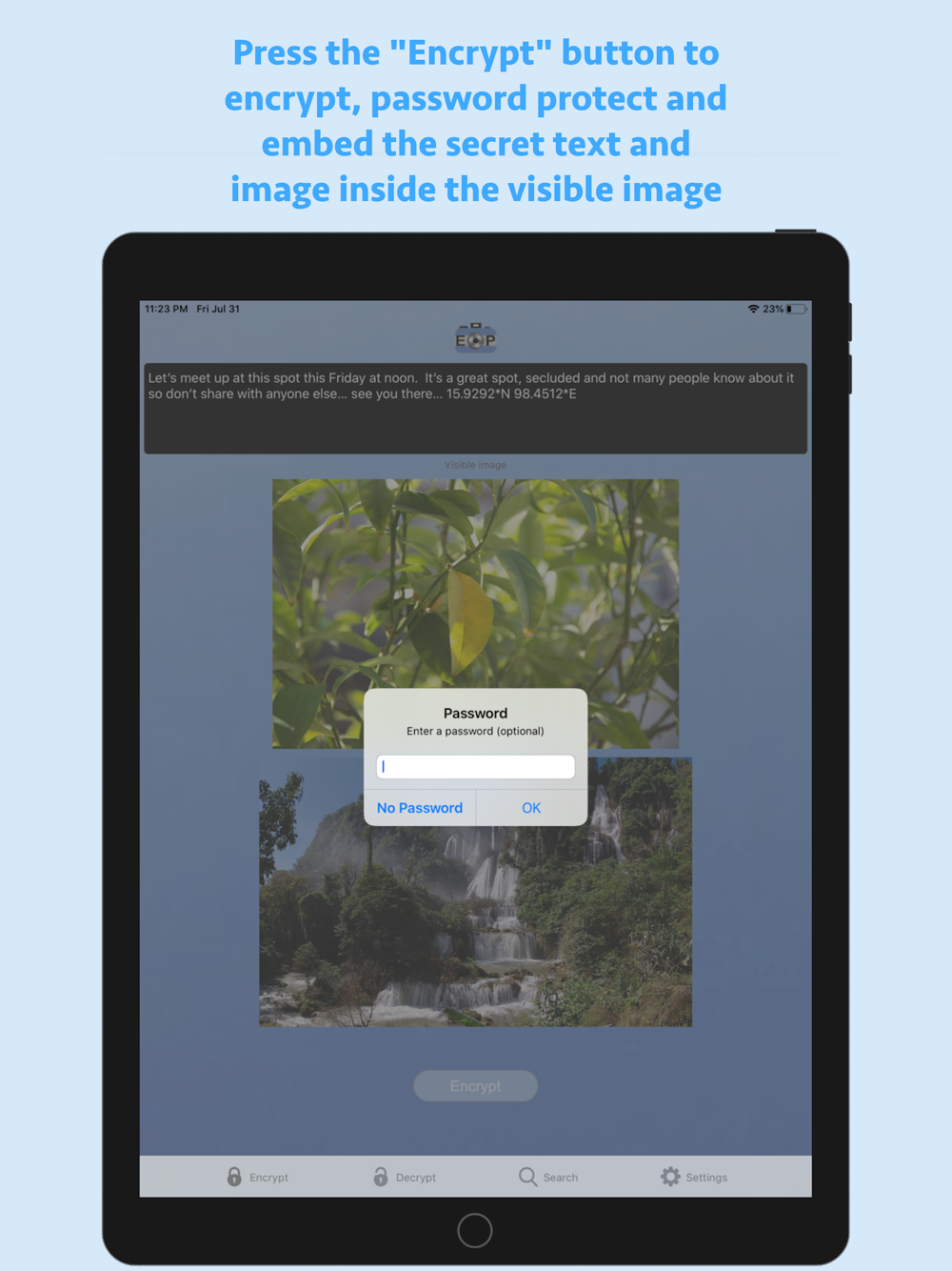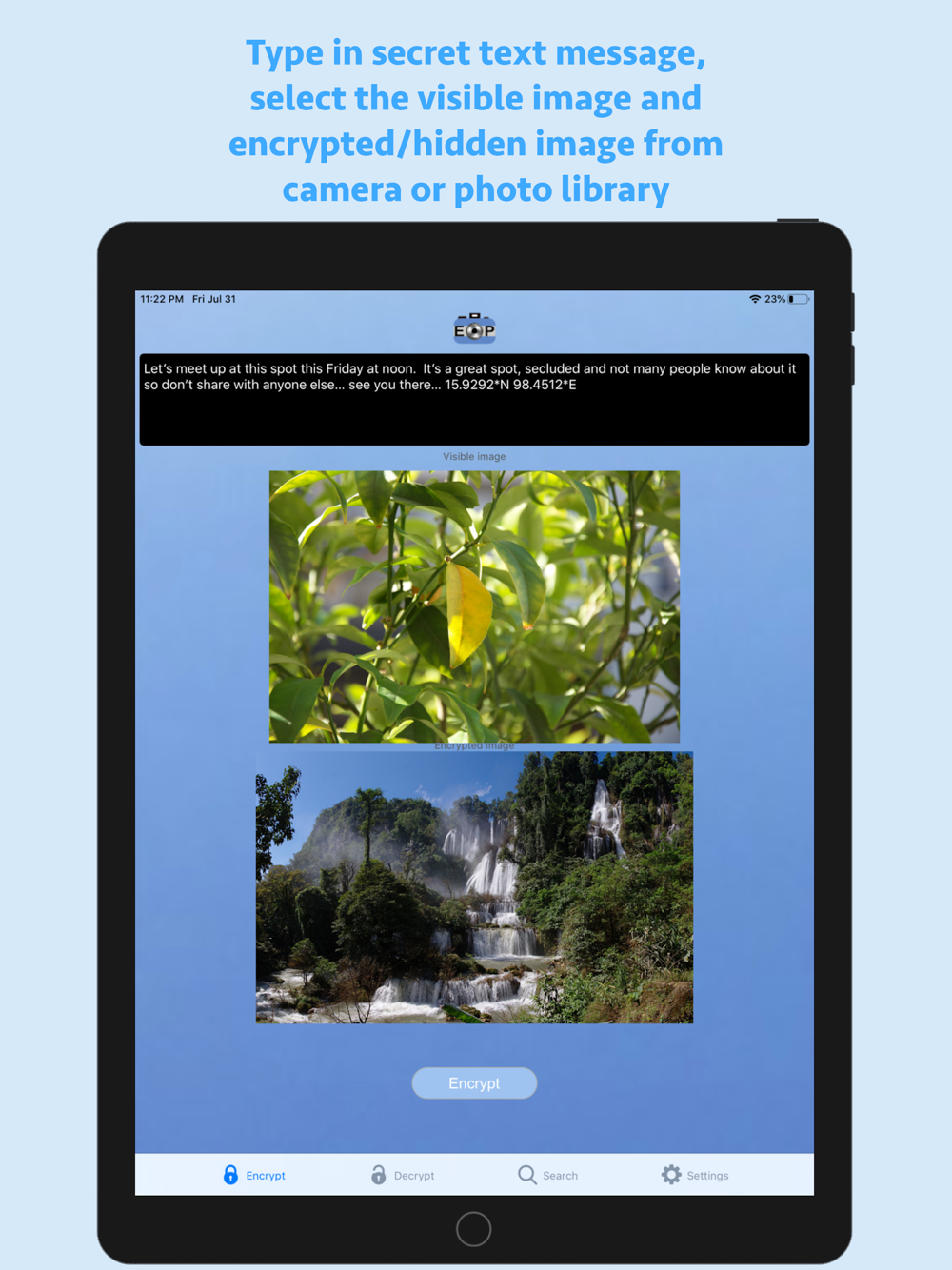 EncryptPic is a fun and interesting way to securely store and share private information and pictures. The private text and picture is encrypted and hidden inside a separate unimportant visible image, allowing it to be not only securely encrypted with password protection, but also hidden in plain sight. On the surface, the otherwise innocuous image will blend in with any other inconsequential images. Nobody know the secret information is securely encrypted with optional password protection and hidden inside the image. This means if someone intercepts or has access to the public image, they will not have knowledge of or access to the additional secret information and embedded image. EncryptPic images can be stored on your phone in the application library, sent by SMS or Email messaging and stored anywhere else that they remain in full unaltered original format (for example on a computer hard drive, photo storage web sites, etc.). It is important to validate that any storage location does not alter the images and will store and return the unaltered original image in its full resolution. Any altering of the image from its original format can render the encrypted information inaccessible. For example, storing in the iPhone photo library will alter the image and render the encrypted information inaccessible. Always test any new storage method to make sure decryption is not affected before relying on that storage method. We cannot assist with repairing any corrupted altered or corrupted files.