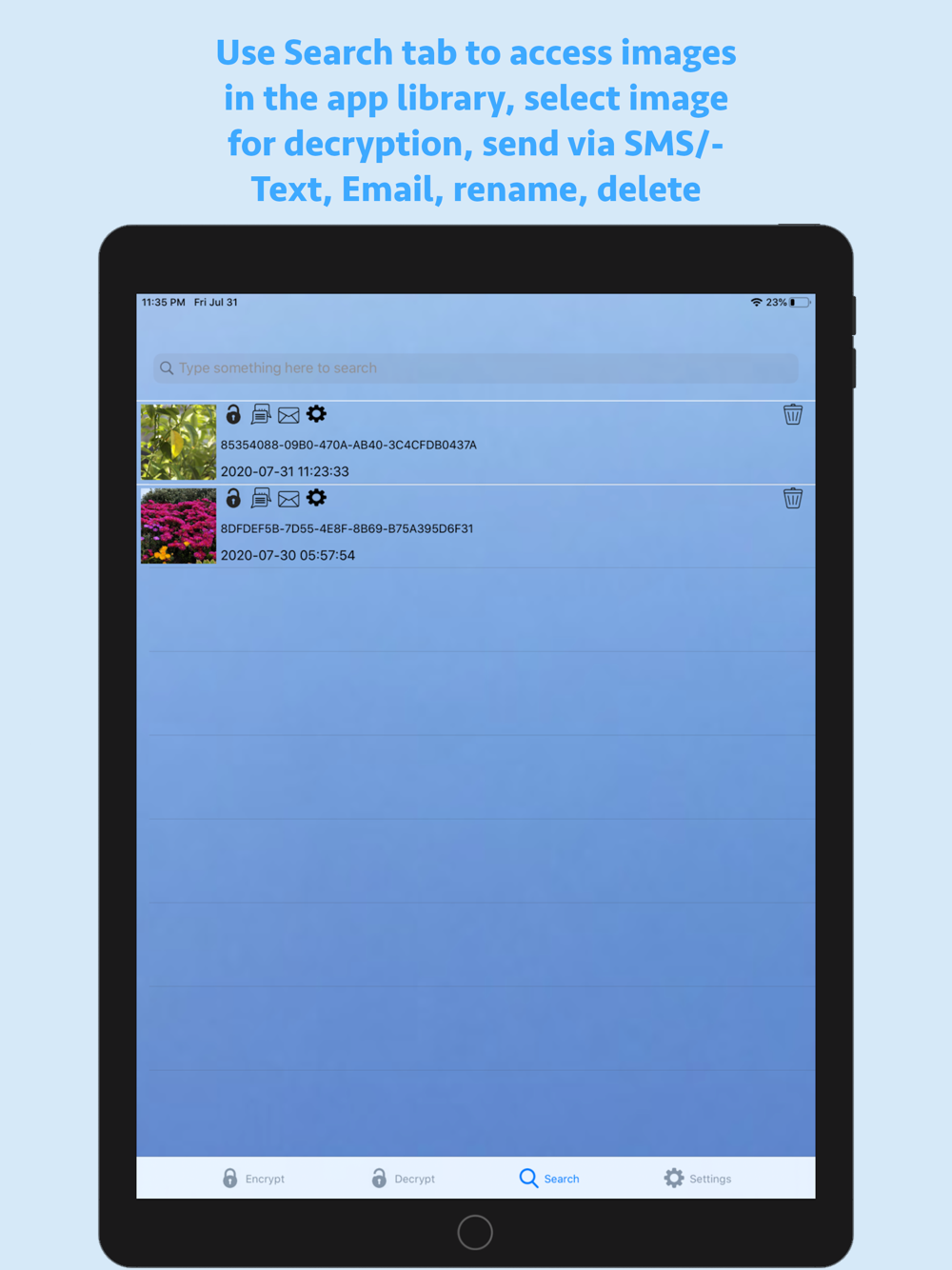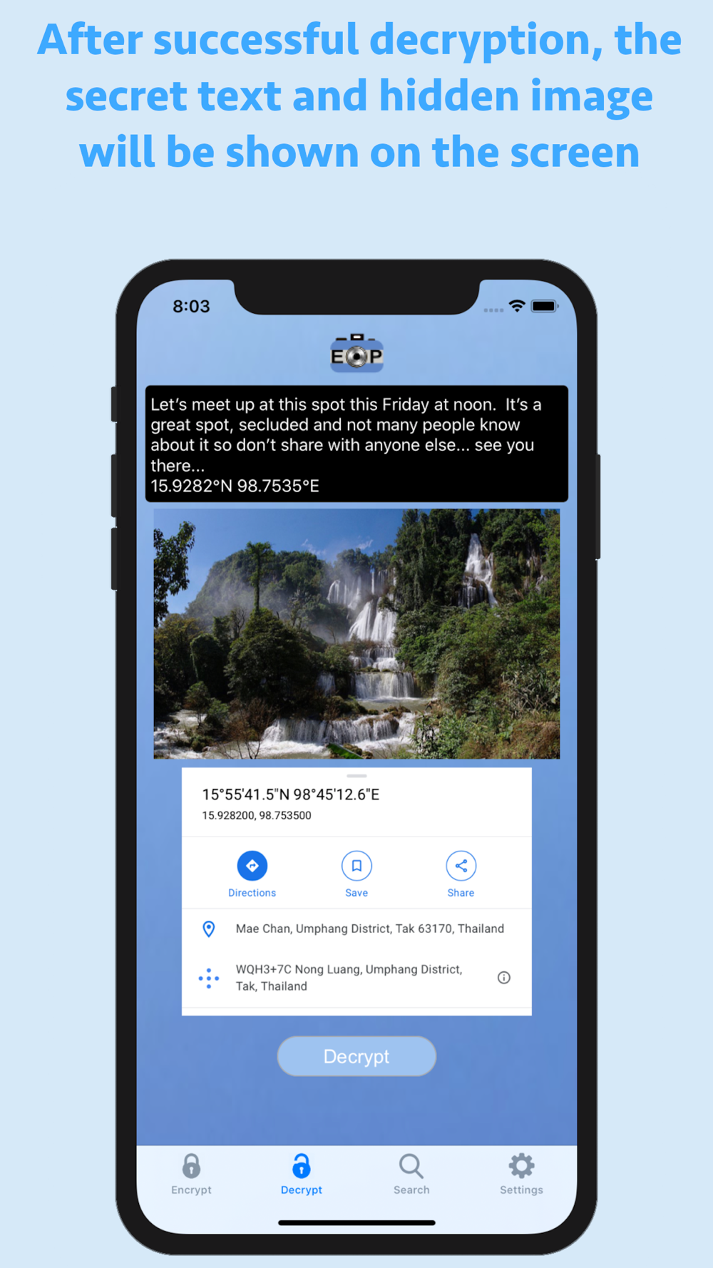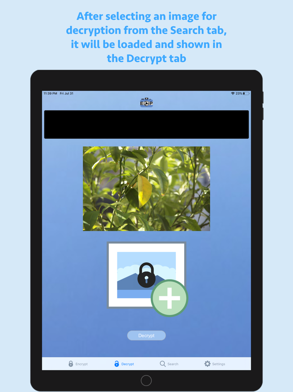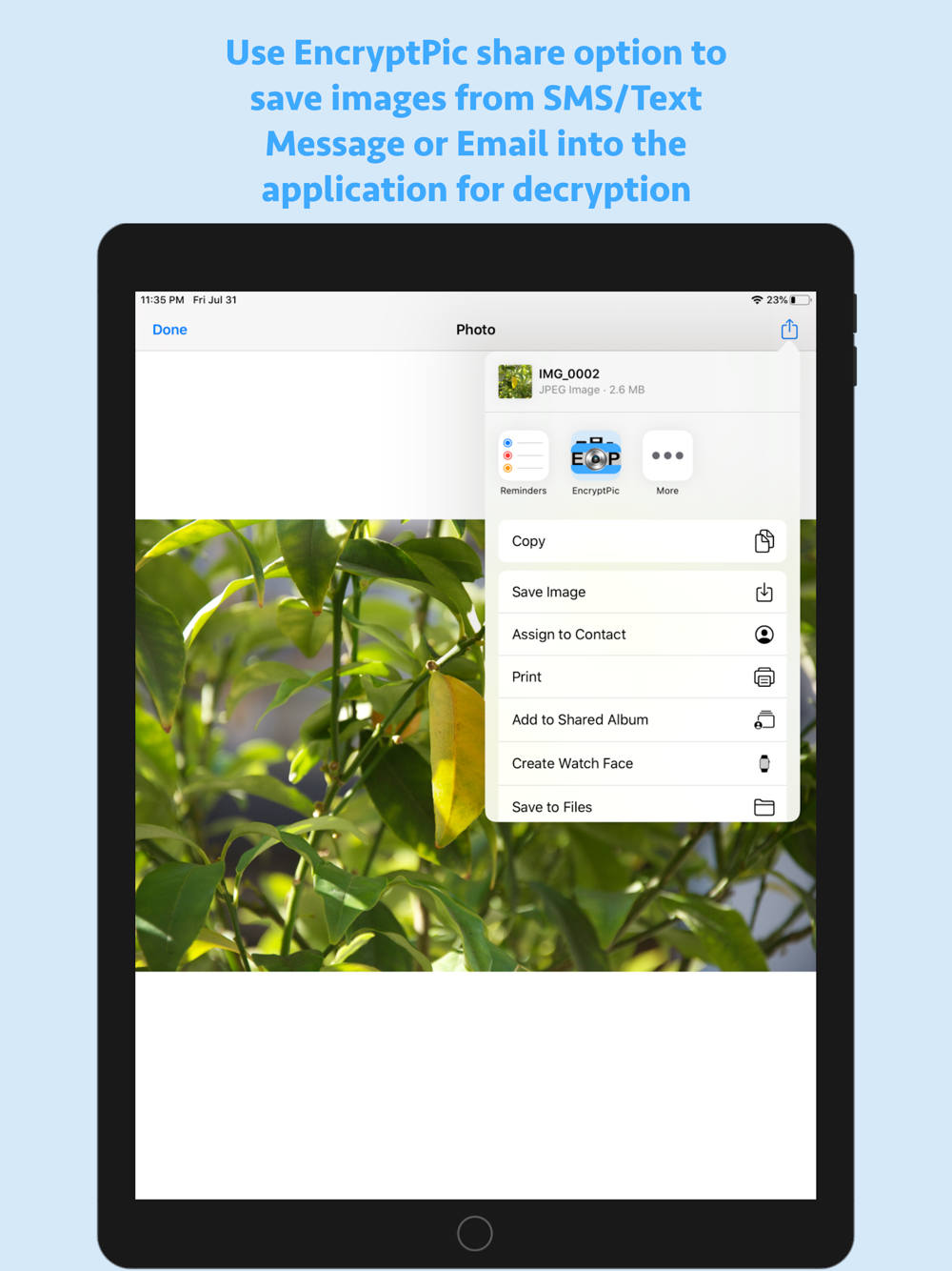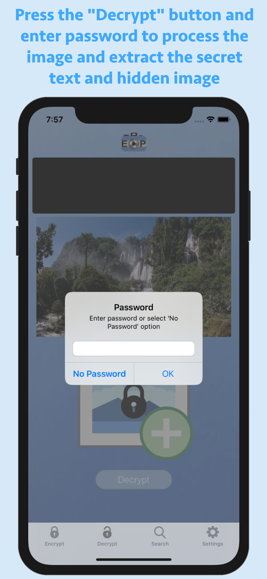 EncryptPic is a fun and interesting way to securely store and share private information and pictures. The private text and picture is encrypted and hidden inside a separate unimportant visible image, allowing it to be not only securely encrypted with password protection, but also hidden in plain sight. On the surface, the otherwise innocuous image will blend in with any other inconsequential images. Nobody know the secret information is securely encrypted with optional password protection and hidden inside the image. This means if someone intercepts or has access to the public image, they will not have knowledge of or access to the additional secret information and embedded image. EncryptPic images can be stored on your phone in the application library, sent by SMS or Email messaging and stored anywhere else that they remain in full unaltered original format (for example on a computer hard drive, photo storage web sites, etc.). It is important to validate that any storage location does not alter the images and will store and return the unaltered original image in its full resolution. Any altering of the image from its original format can render the encrypted information inaccessible. For example, storing in the iPhone photo library will alter the image and render the encrypted information inaccessible. Always test any new storage method to make sure decryption is not affected before relying on that storage method. We cannot assist with repairing any corrupted altered or corrupted files.