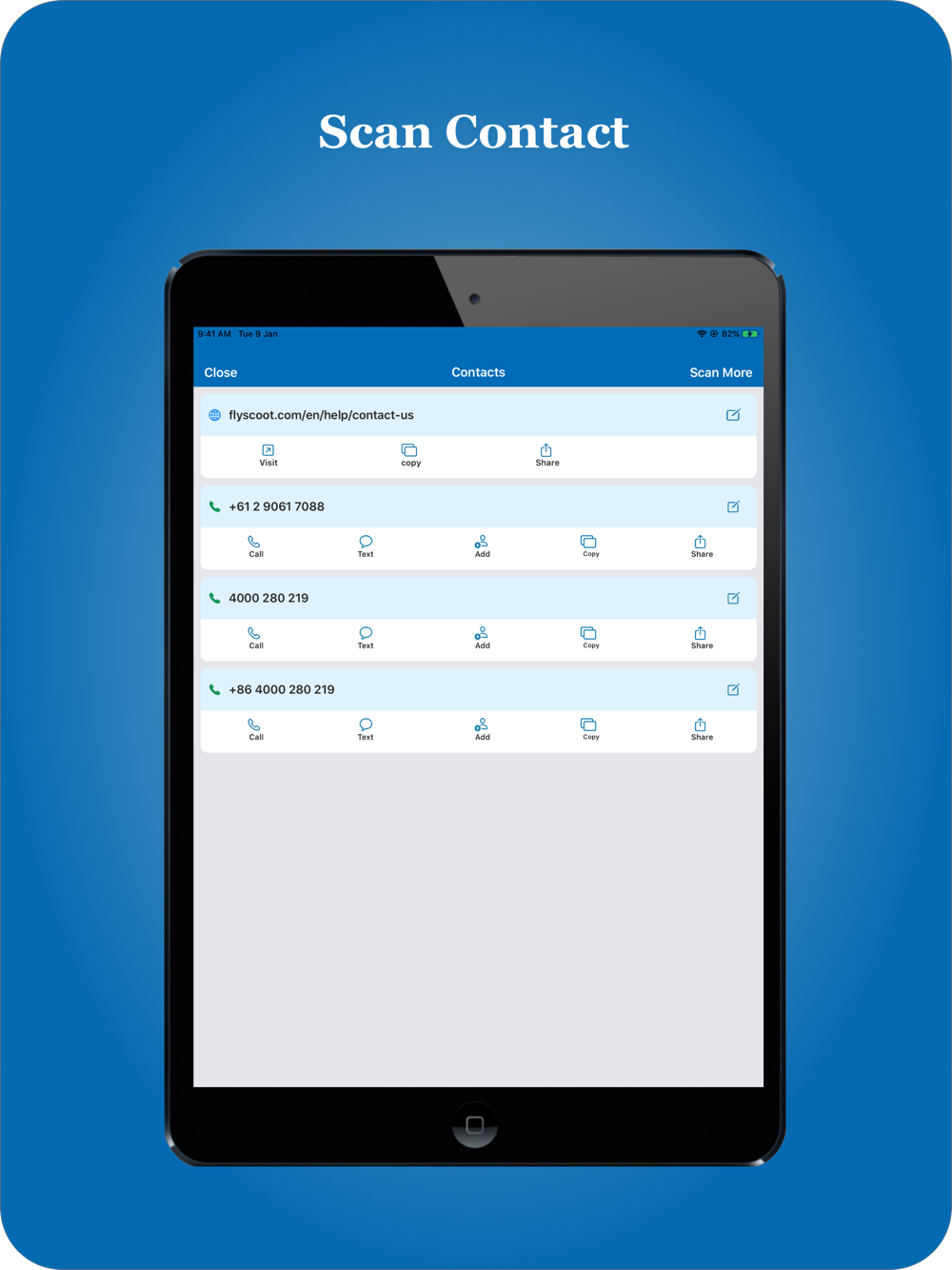It also provides ability to scan documents into PDF files, scan contacts(Phone number, Email and websites), scan Qr codes and provide quick options to call, message, mail, browse, copy and share.