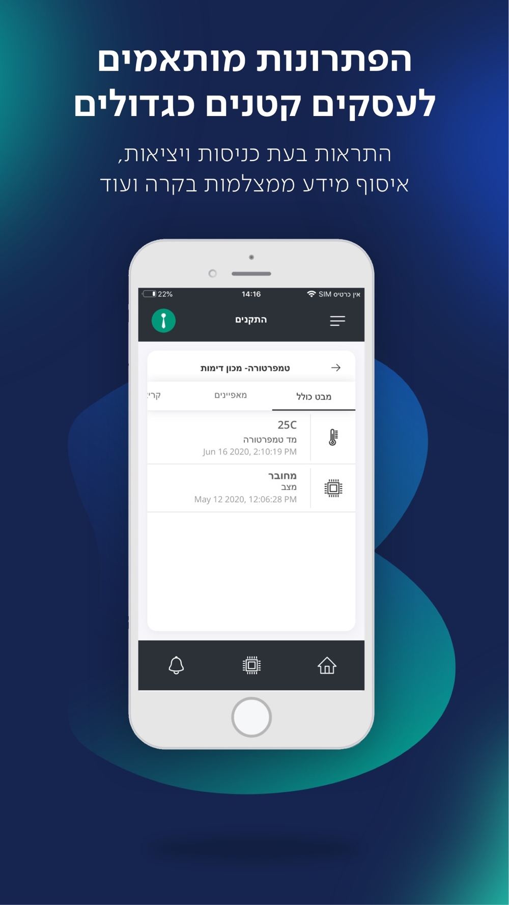 אפליקציית עסק חכם עכשיו אצלך בכף היד, האפליקציה מציגה בצורה פשוטה, קלה ונוחה את ההתקנים המנוטרים בעסק, קבלת התראות ועדכונים בזמן אמת בכל מקום ובכל זמן.