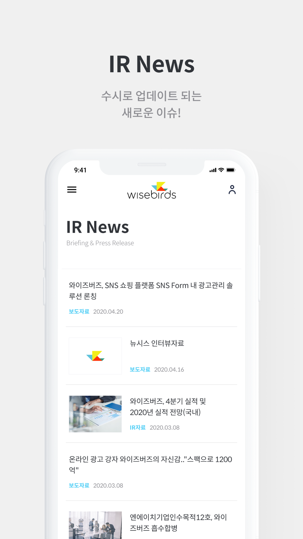 와이즈버즈 “IR Page” Application은 실시간 주가, IR일정, 분기별 실적발표자료, 다양한 IR News, 주요 경영보고서, 재무정보, 공시, IR담당자 Contact 정보 등 최신 IR정보를 제공합니다.