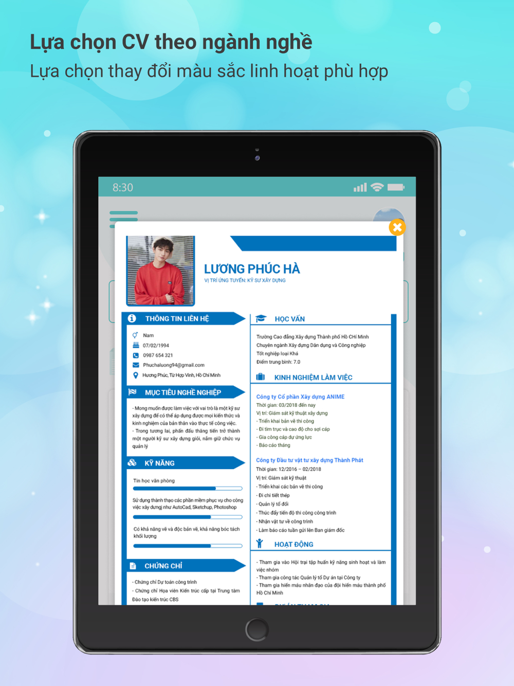 Tuy nhiên nếu chỉ “đẹp mã” thì có lẽ ứng dụng CV timviec365.com.vn sẽ không được hàng triệu người dùng sử dụng và tải CV xuống mỗi ngày. Nó thực sự là một sự hoàn chỉnh về tất cả các công cụ cần có để tạo nên một chiếc CV hiện đại ngày nay. Nếu như các nhà thiết kế chuyên nghiệp có phần mềm photoshop để điều chỉnh từng yếu tố của một sản phẩm design như CV thì chúng ta có thể gọi ứng dụng là phần mềm photoshop CV dành riêng cho điện thoại.
