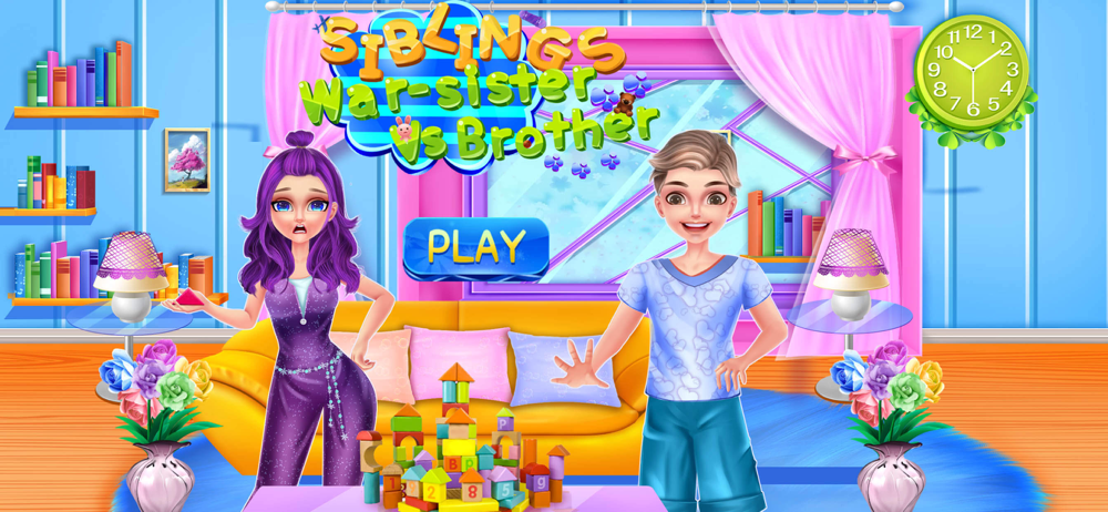 There is a sister and a brother in a family. They both are sort of naughty. If one is doing something, the other will interrupt. Every day, they compete with each other. Today,when one of them is in the living room, the other rocks the boat. The living room needs cleaning. While cleaning up,pay attention to the interruption by the other and take them back where they were before. After cleaning up the living room,one of them will practice the guitar in the bedroom. Then make a strawberry cake in the kitchen. Finally,get dressed and wear some decorations to take photos. Now let's have a look at their competition.