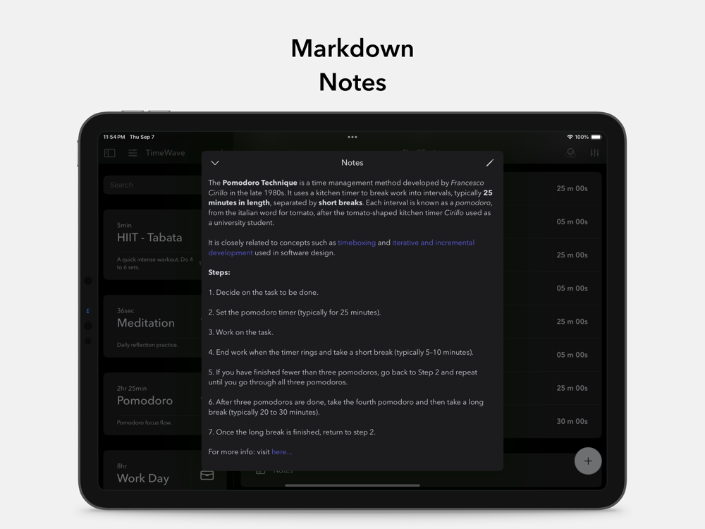 • Focus Timers — create pomodoro timers or any kind of work-break timewaves. You are not restricted to 25 minute session, you can create any sequence that suits your preferences.