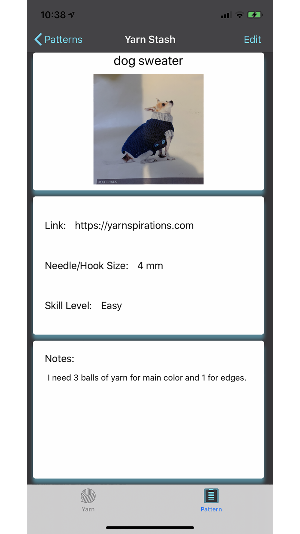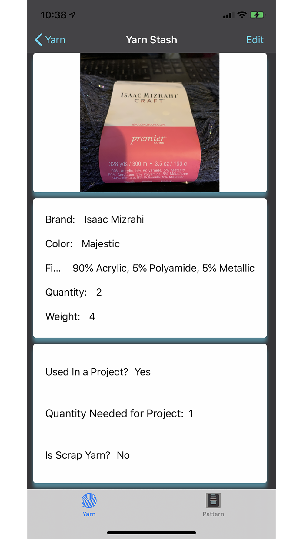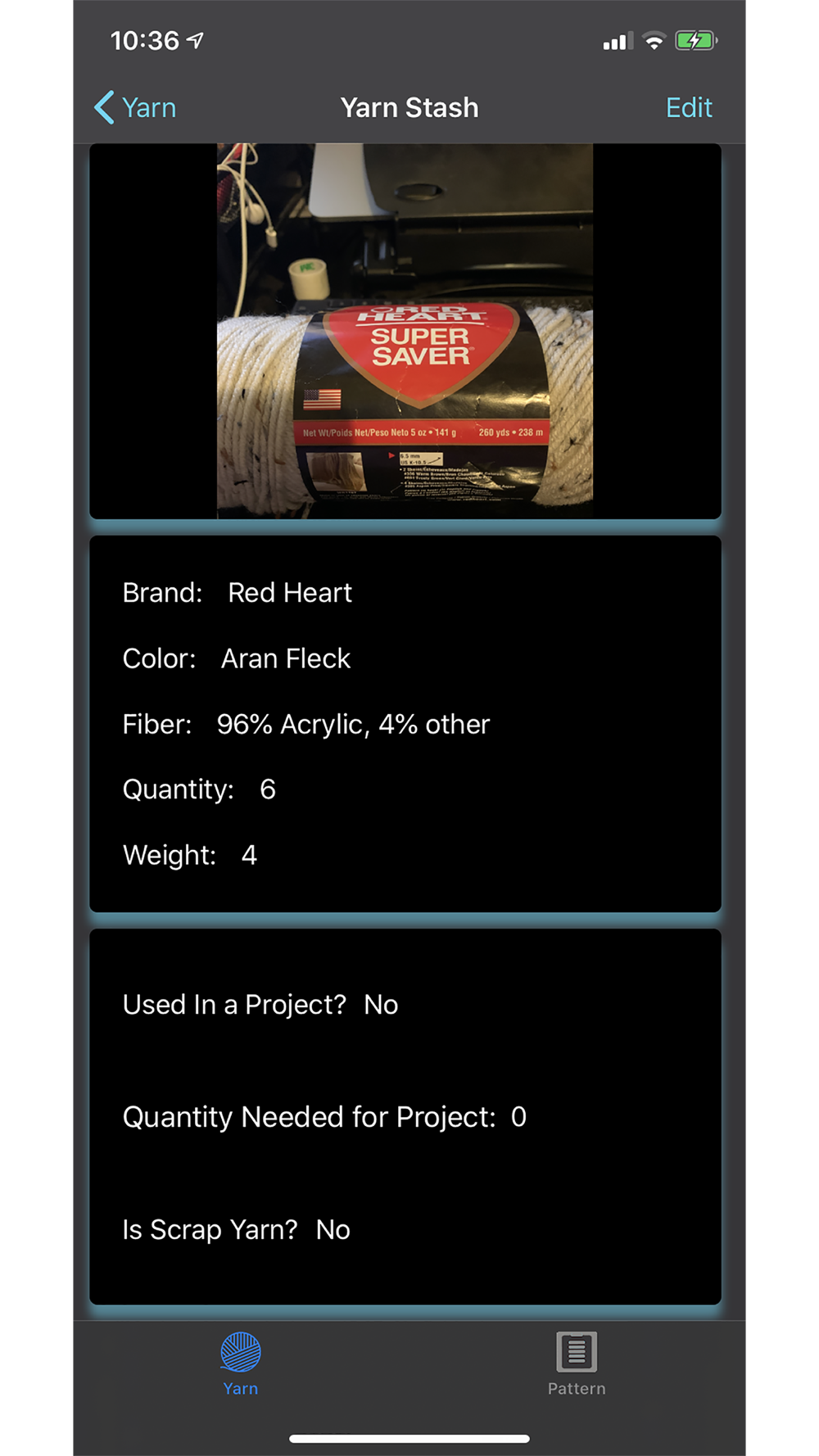 With this app you will have a clear idea of what yarn you have in stock. No more going to the store only to buy yarn you already have or not buy yarn thinking you had enough for your next project.
