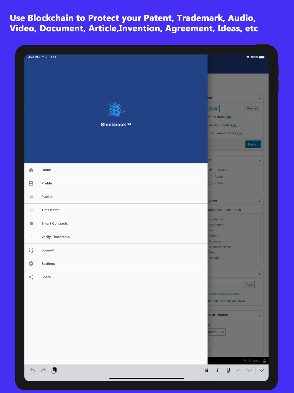Your Notary in the Cloud - Post, Timestamp & Create Smart Contracts. Use Blockchain to Protect your Trademark, Audio, Video, Document, Article, Patent, Invention, Agreement, Ideas, etc