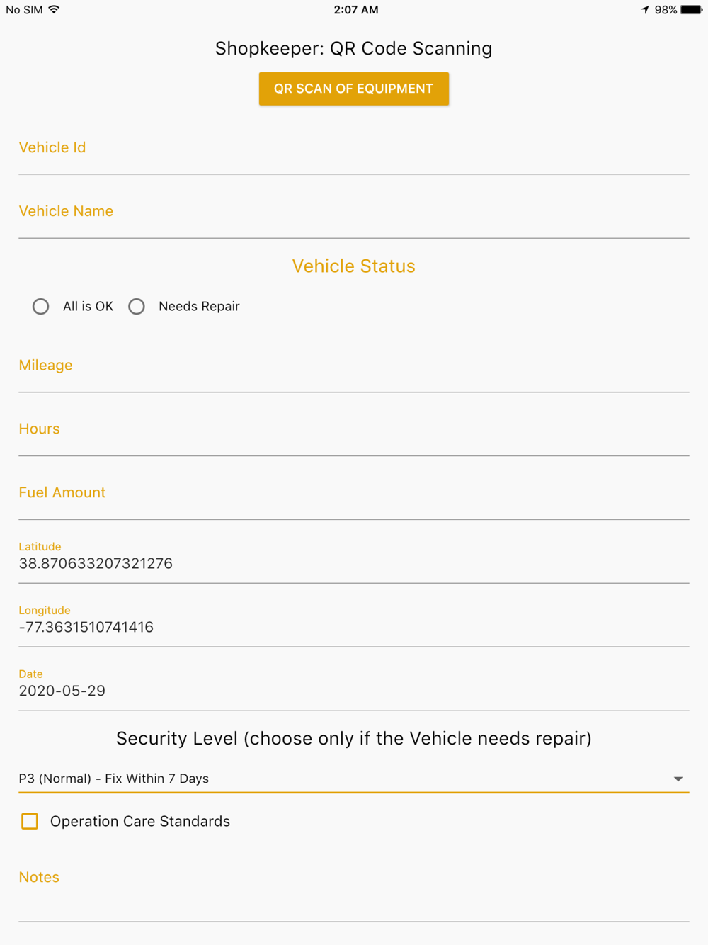 Users will use custom QR Codes in order to scan equipment codes and enter updated information regarding equipment needs and usage to the Auto-ShopKeeper computerized management software system. This mobile application works as an arm to Auto-ShopKeeper in order to obtain equipment information directly from the user and/or equipment operator in order to keep the equipment running at peak condition.