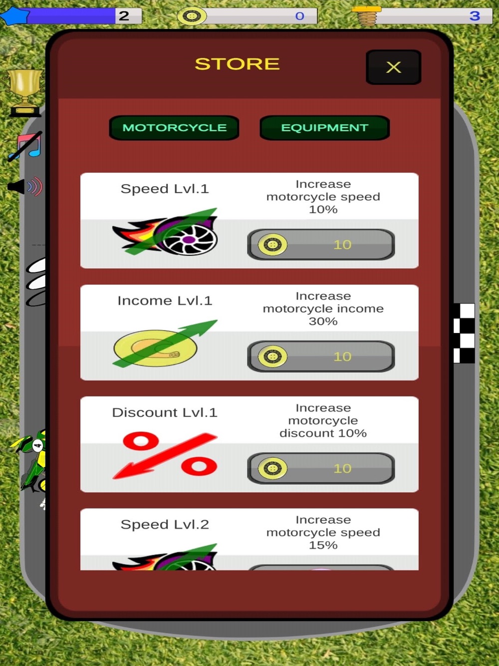 应用改进:您可以购买带轮子的设备,以改善摩托车;提高速度,增加收入并增加折扣。每种升级类型都有九个级别。尽快全部购买!