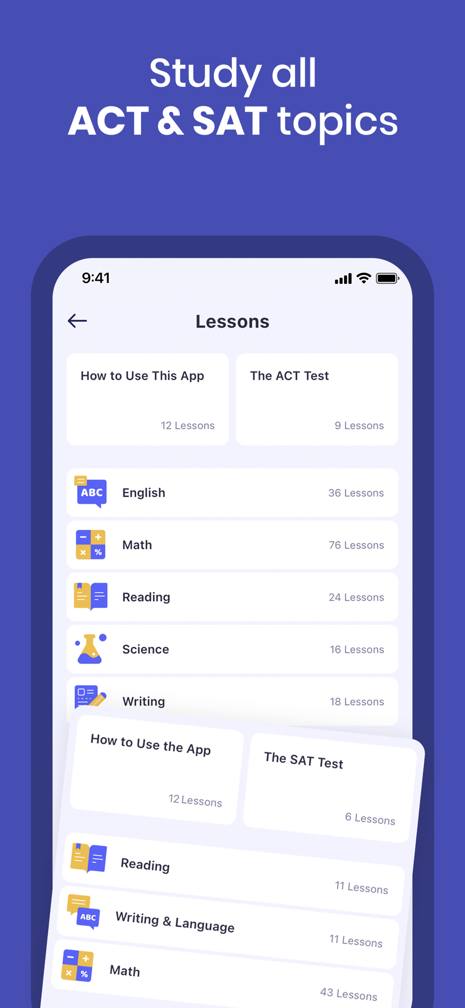 Getting ready for the most crucial exams couldn’t be easier. You can now study and practice at your own pace, without stress and pressure, and achieve great results. All necessary content is available in one app. Select your test date, and receive a study plan tailored personally for your needs. Track your progress, stay motivated, and ace the ACT or SAT!