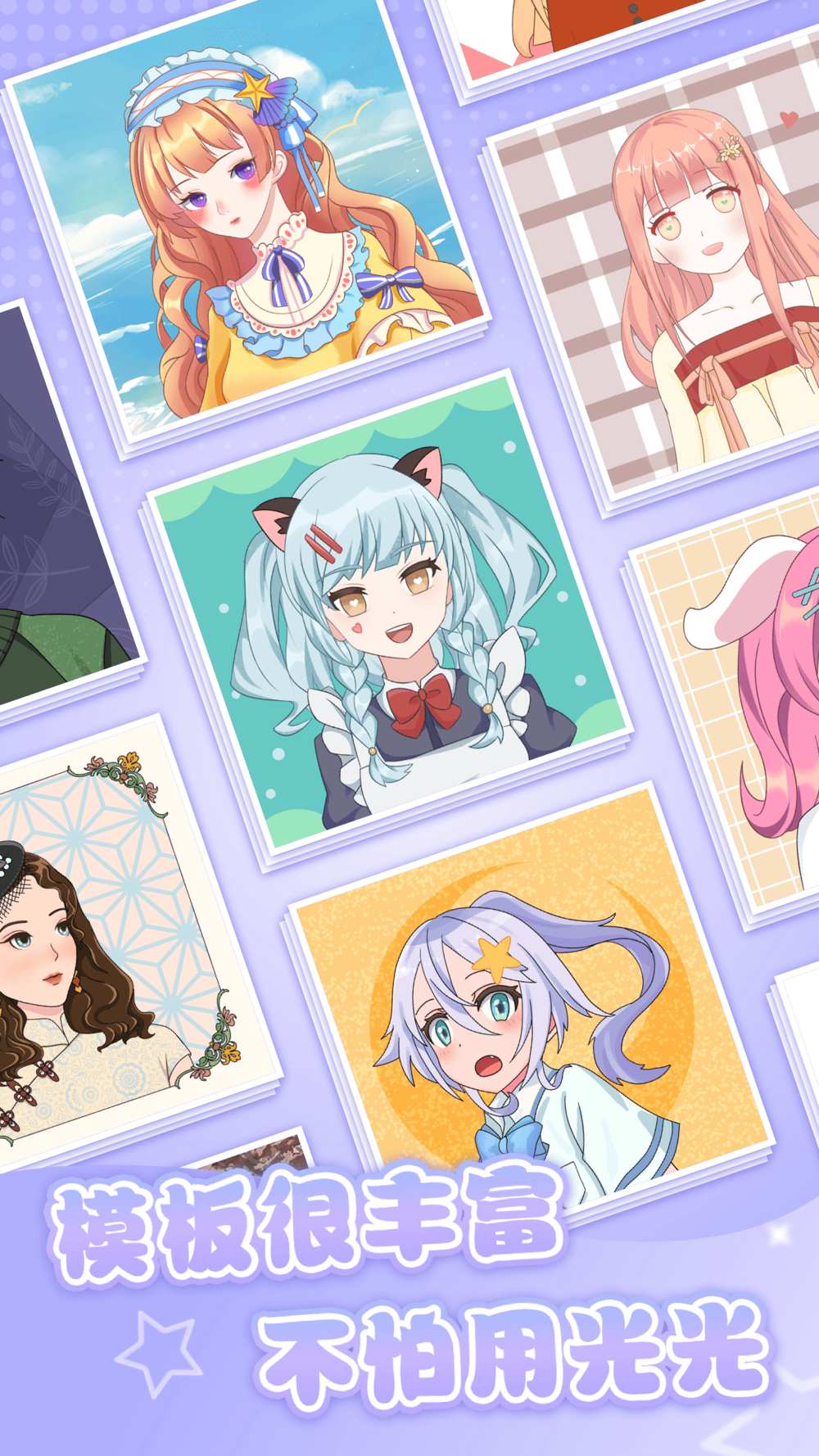 细腻的表情贴纸,海量的绝美模板,自由DIY拼图,打造专属个人头像。