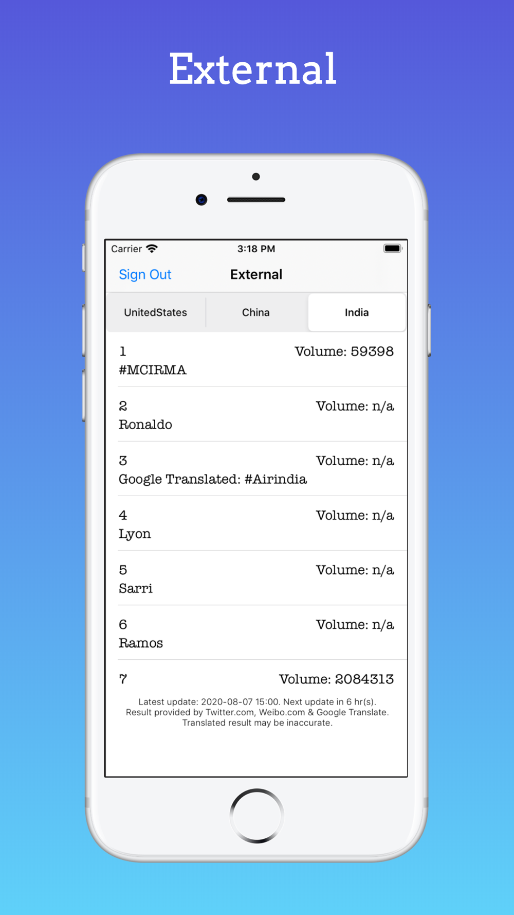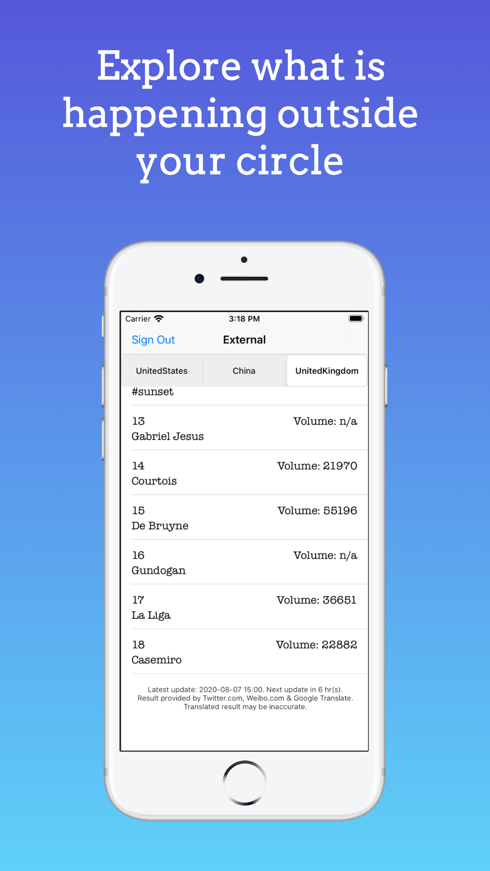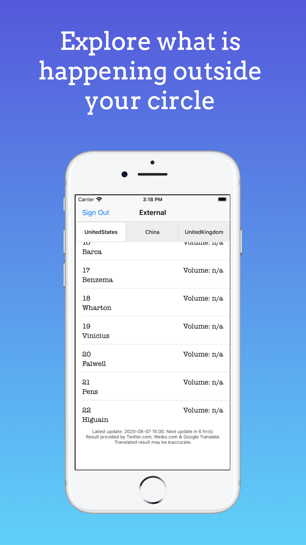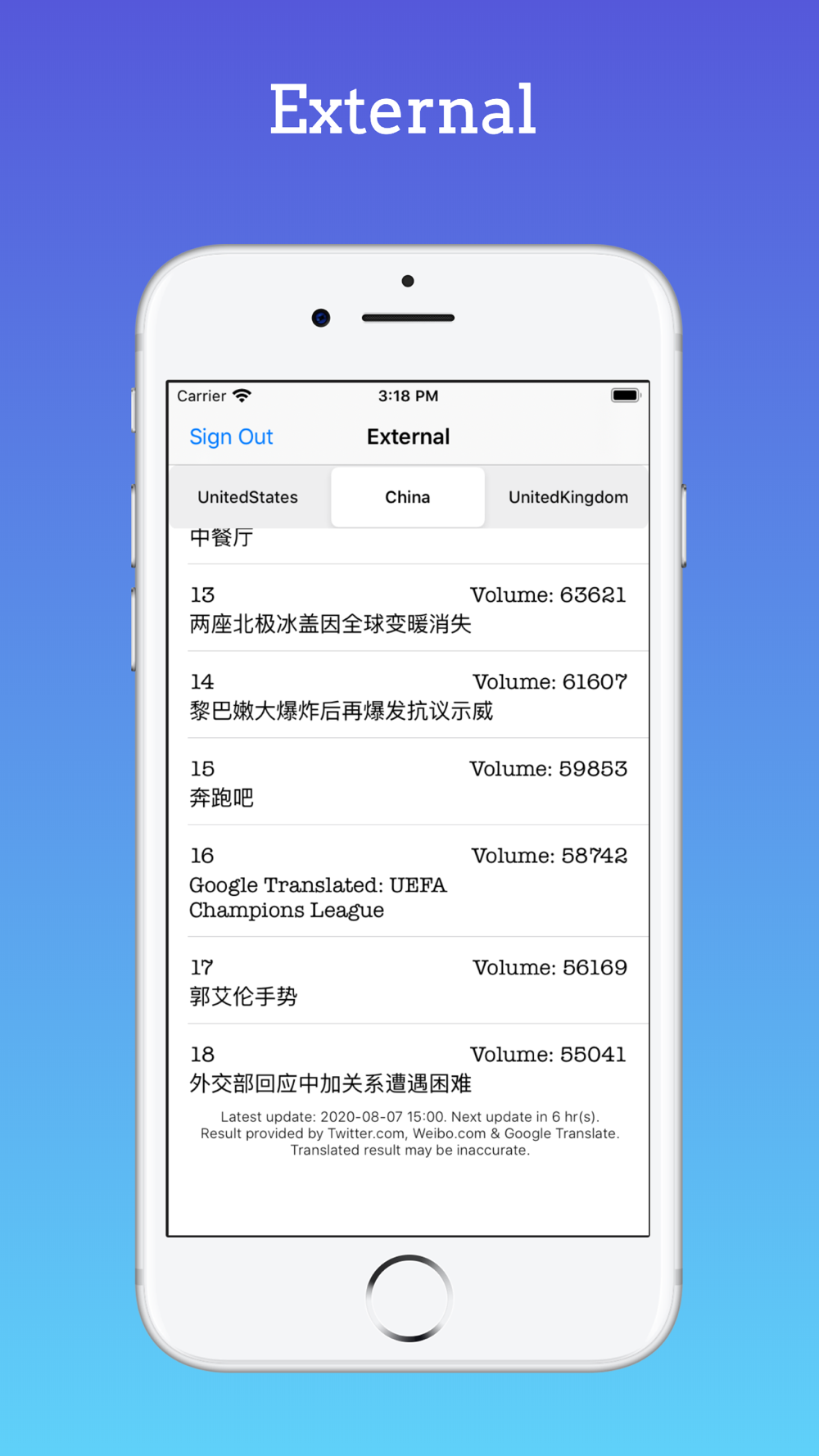 The 1.0 version contains a list of major countries. I encourage you to check the trending topic for different countries by using the built-in Google Translate result. The result probably will be inaccurate. But at least it is the better machine translation I can find on the market.